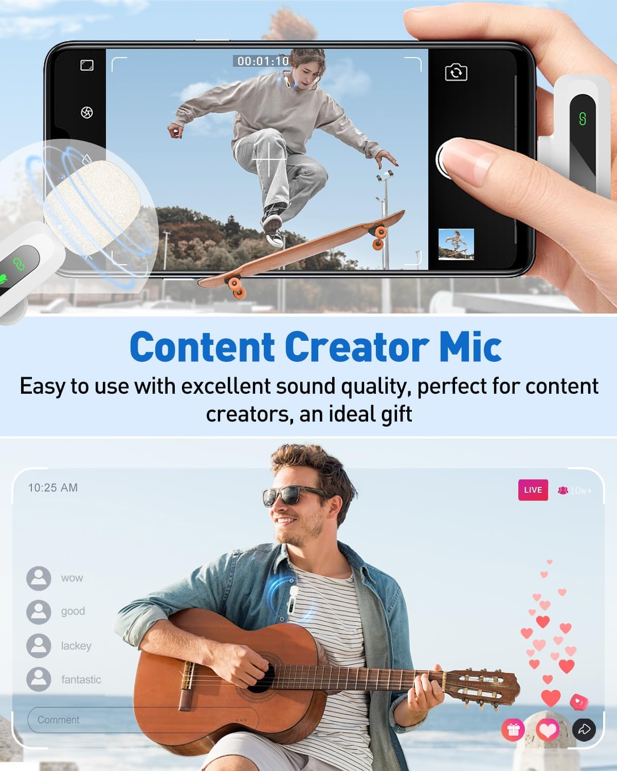 Plug &Play with Intuitive Interface: GoorDik wireless mini mic is an effortless operation. Each function is accompanied by corresponding indicator lights. You can set the different functions of noise reduction, original sound, and mute function easily with the intuitive user interface. Plus, it is equipped with 1 rotatable microphone clip on each mic transmitter, allowing you to adjust the direction for optimal omni-pickup, enhancing your recording audio