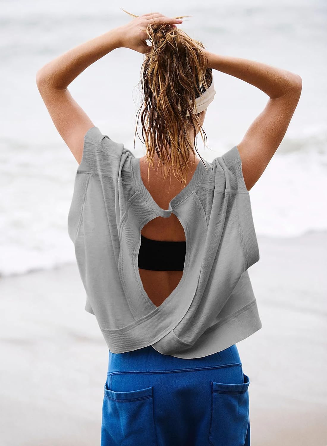 Features: Slight crop, shorter sides, wide neckline, open-cut back and ribbed wrist detail, the open back tops for women is fashionable and sexy, which increases the breathability, effectively dissipates body heat, and keeps cool and comfortable