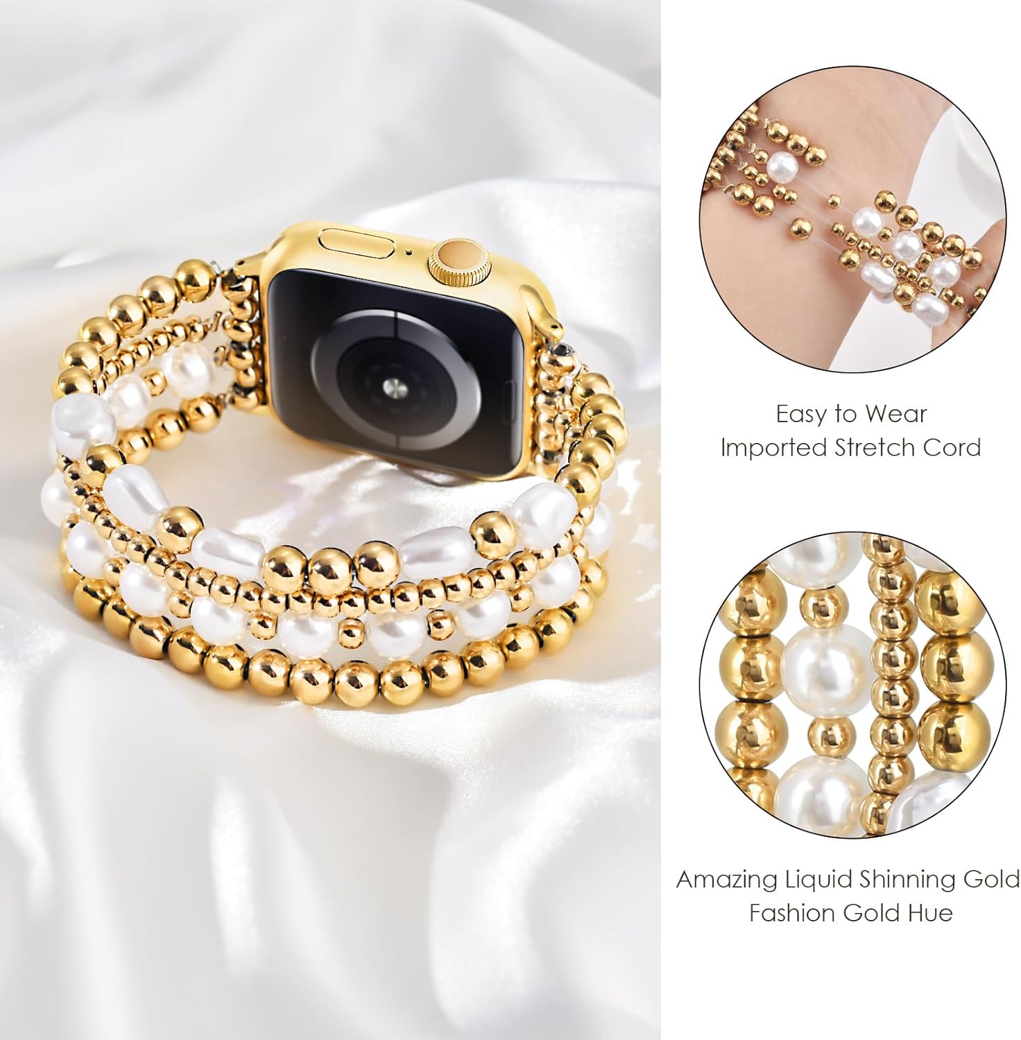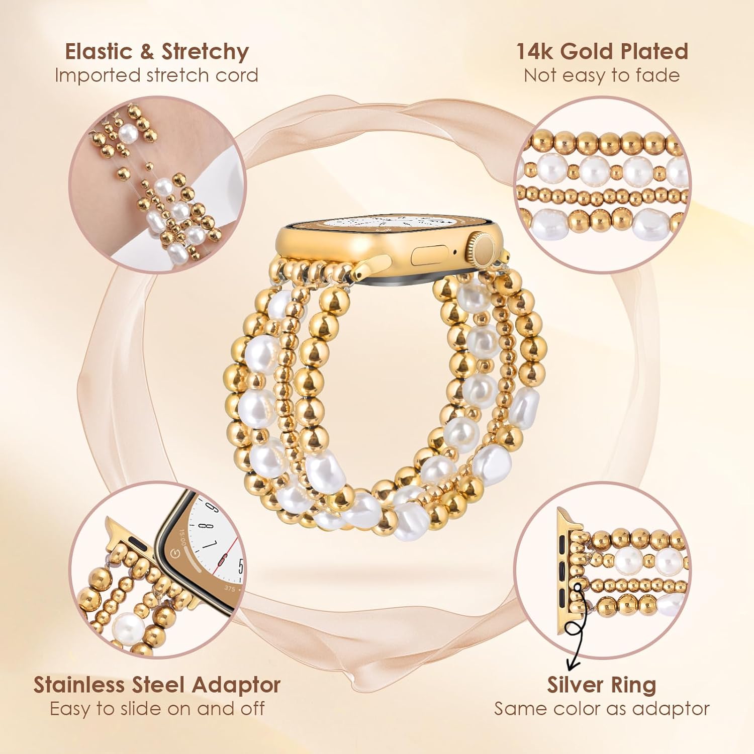 Gold Beaded Apple Watch Band: Made of premium quality stainless steel with 14K real gold plating that won't fade easily and can maintain its luster for a long time. Apple watch beaded bands for women contain 2 gold beaded bracelets and 2 pearl-beaded bracelets. It's very comfortable to wear. It is an excellent choice for people with susceptible skin.