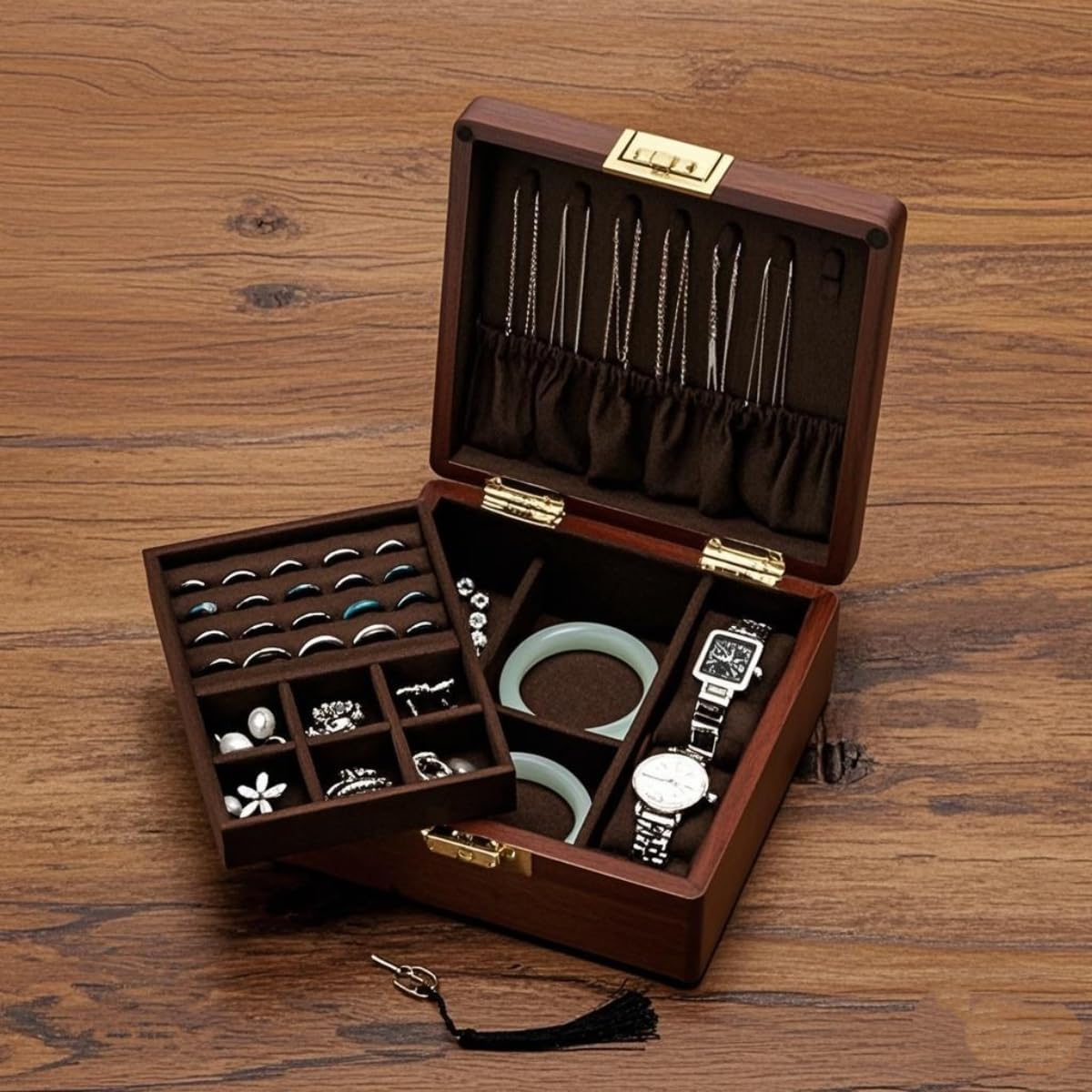 Bescott 2 Layer Solid Wooden Jewelry Box with Lock and Key for Women Men Vintage Velvet Wood Jewelry Organizer Storage for...