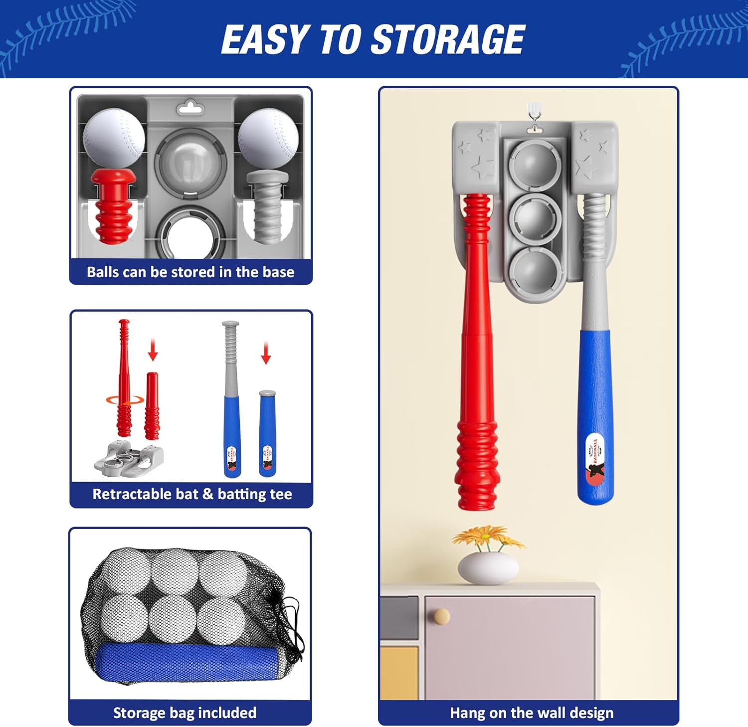 EASY TO STORAGE - Our baseball toys come in 4 designs to help you save space: ①“hang-on-the-wall” design, ②retractable bat and batting tee, ③Includes one storage bag for balls ④2 balls can be stored in the base, also portable to carry