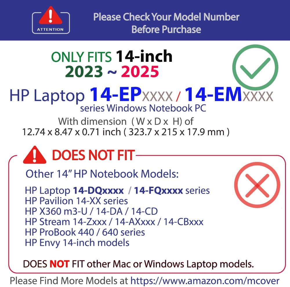 Designed to perfectly fit the 2023 ~ 2024 14" HP Laptop 14-EPxxxx series Notebook PC computers with dimension of 12.74 x 8.47 x 0.71 inch ( 323.7 x 215 x 17.9 mm )