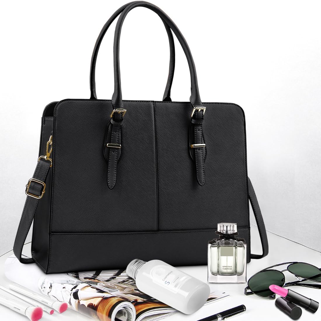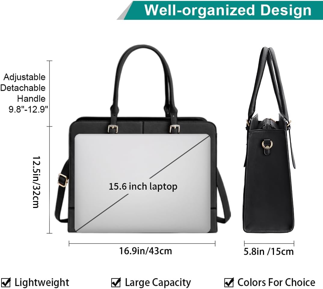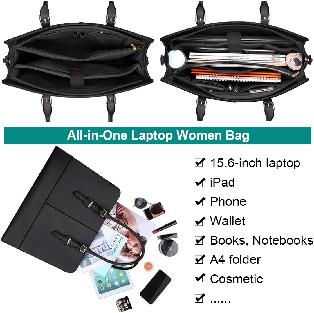 Ideal Organizer Womens Briefcase:Three layers are designed for different use: one laptop compartment to hold a 15.6" laptop and tablet with room to spare; one zip compartment to secure files and two open sections with room for cosmetic, wallet, A4 folder; Multiple pockets for small essentials, bottles; Exactly keep your daily business essentials well organized.