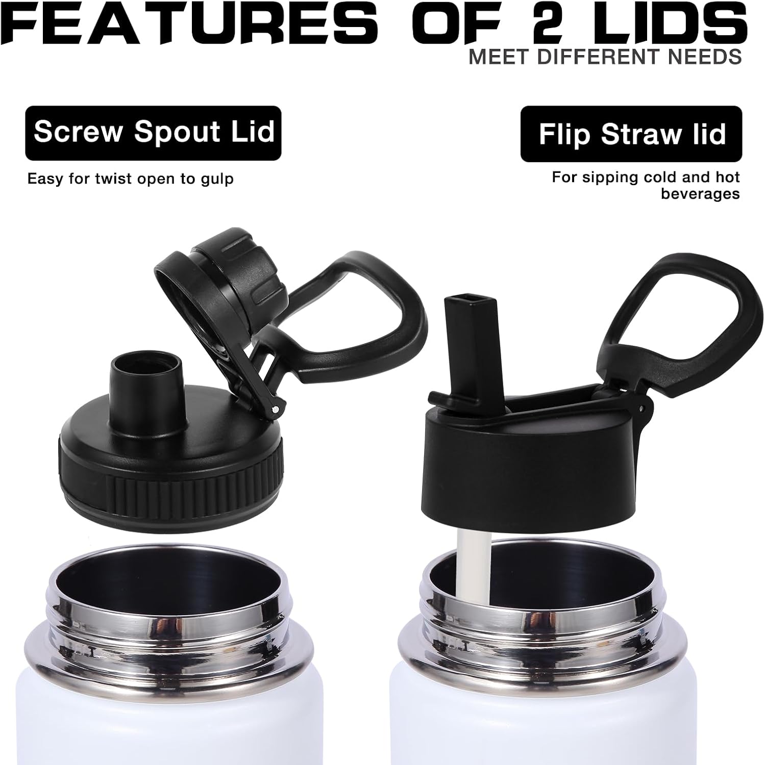 【Upgraded bottle lids】1.The color that echoes with the bottle makes your water bottle more fashionable and beautiful. 2.Handle use of flexible plastics reducesthe possibility of breakage. 3.Wider and thicker leak-proof rubber ring.The spout lid can dispense water quickly and is suitable for hot drinks. Straw lids are suitable for chilled drinks. You can choose a more suitable lid as you like!