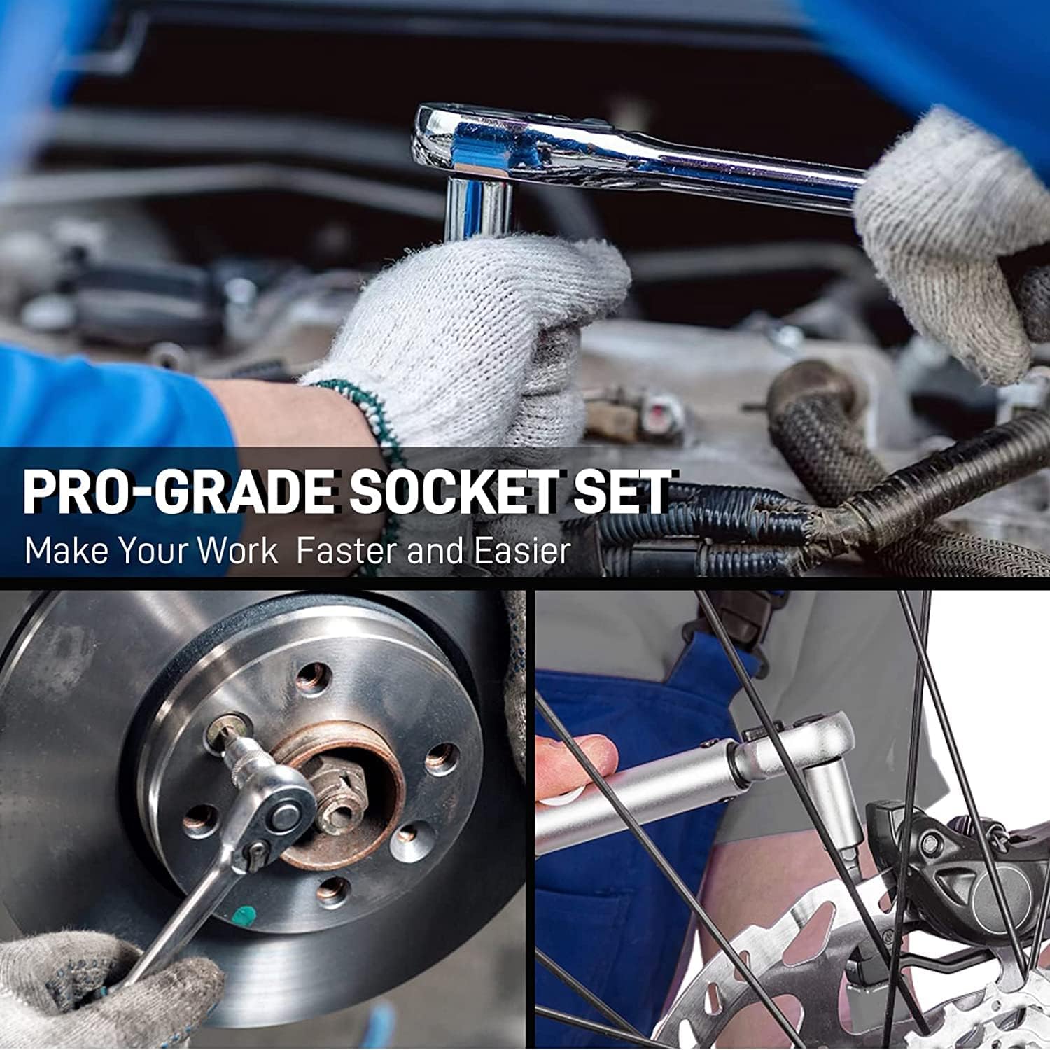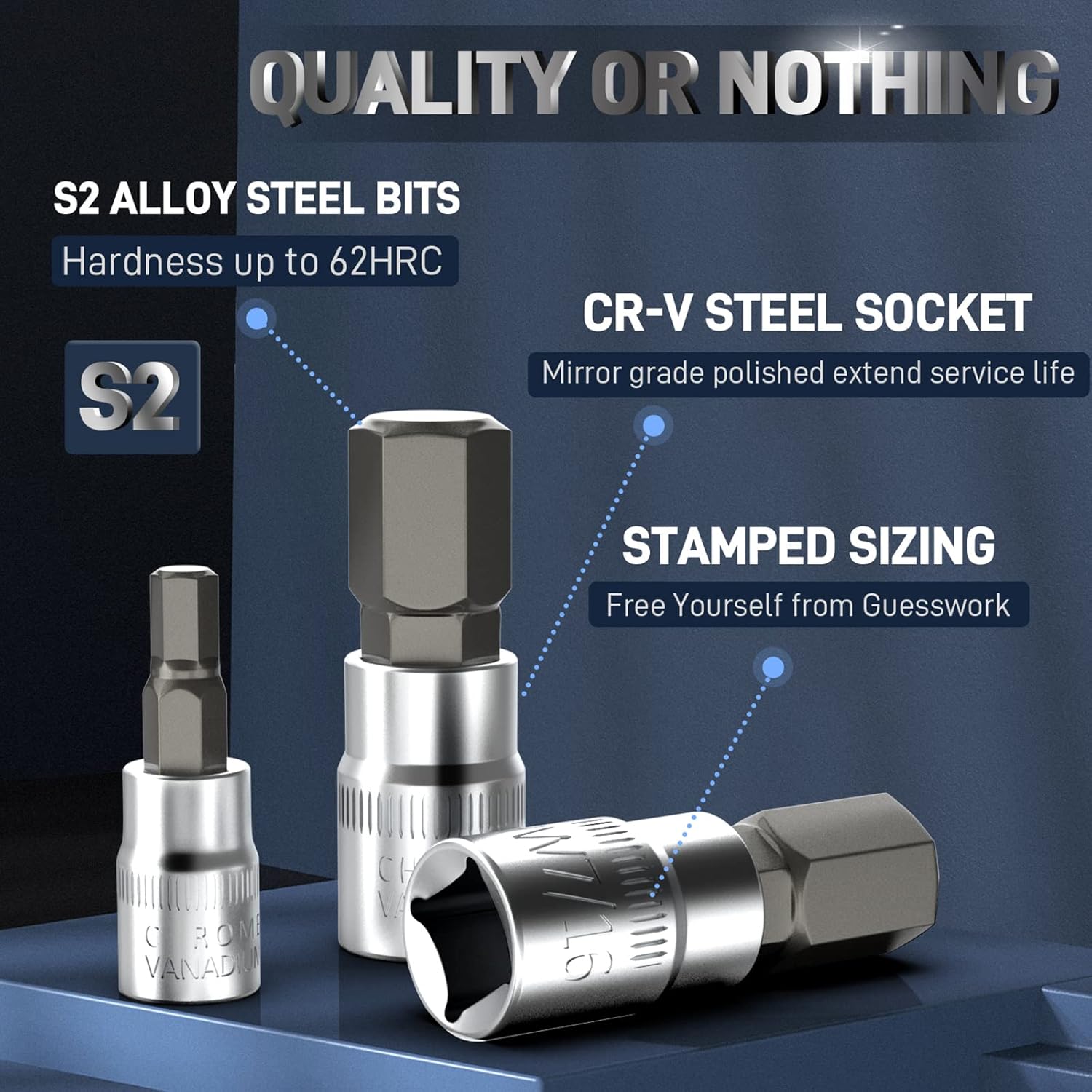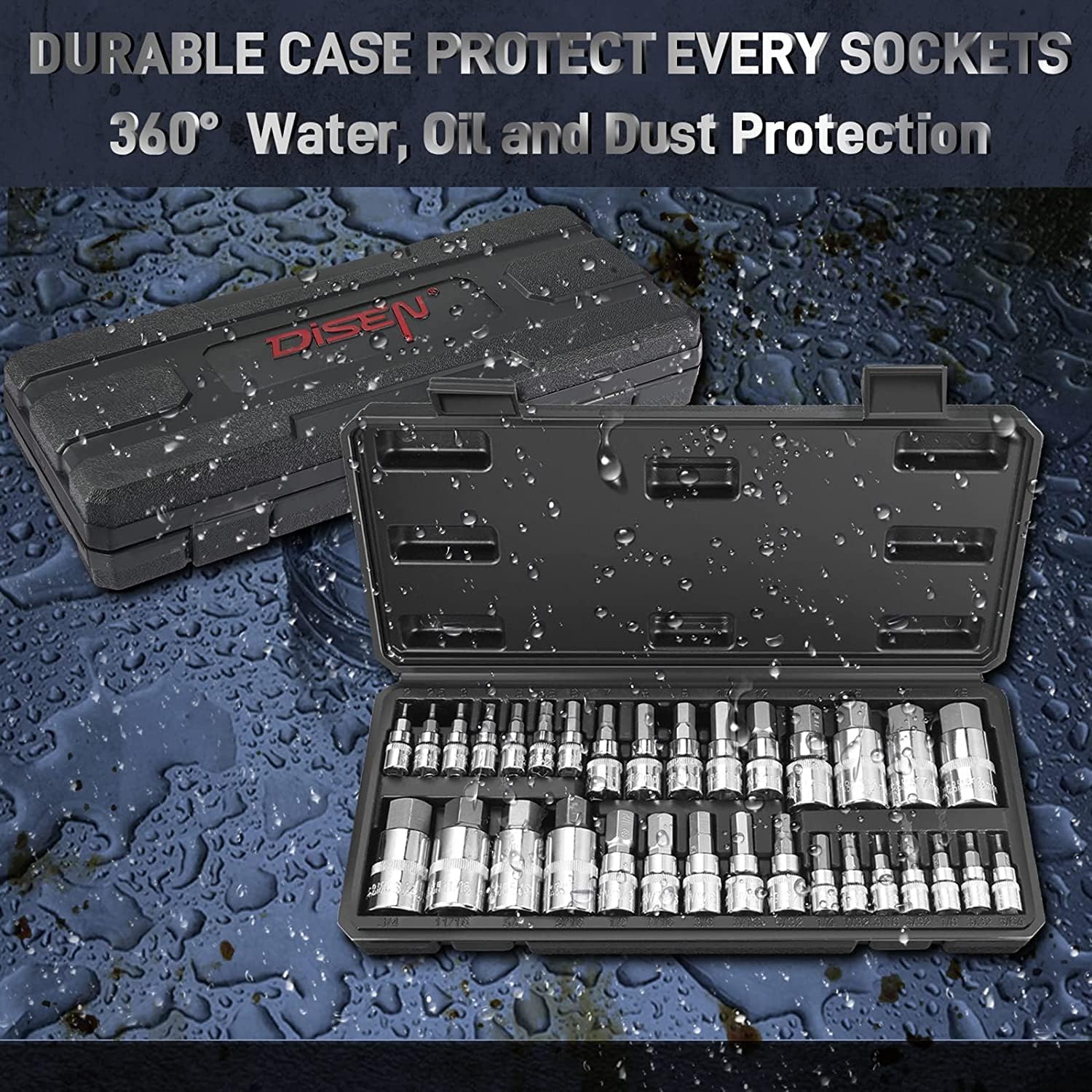 【SAE & Metric Size】DISEN 32 Pieces Hex Bit Socket Set provides both SAE and Metric size options: 16pc SAE HEX: 1/4 inch drive (5/64", 3/32", 1/8", 5/32", 3/16", 7/32", 1/4"), 3/8 inch drive (9/32", 5/16", 3/8", 7/16", 1/2"), 1/2 inch drive (9/16", 5/8", 11/16", 3/4"). 16pc Metric HEX: 1/4 inch drive (2, 2.5, 3, 4, 5, 5.5, 6mm), 3/8 inch drive (7, 8, 9, 10, 12mm), 1/2 inch drive (14, 15, 17, 19mm)