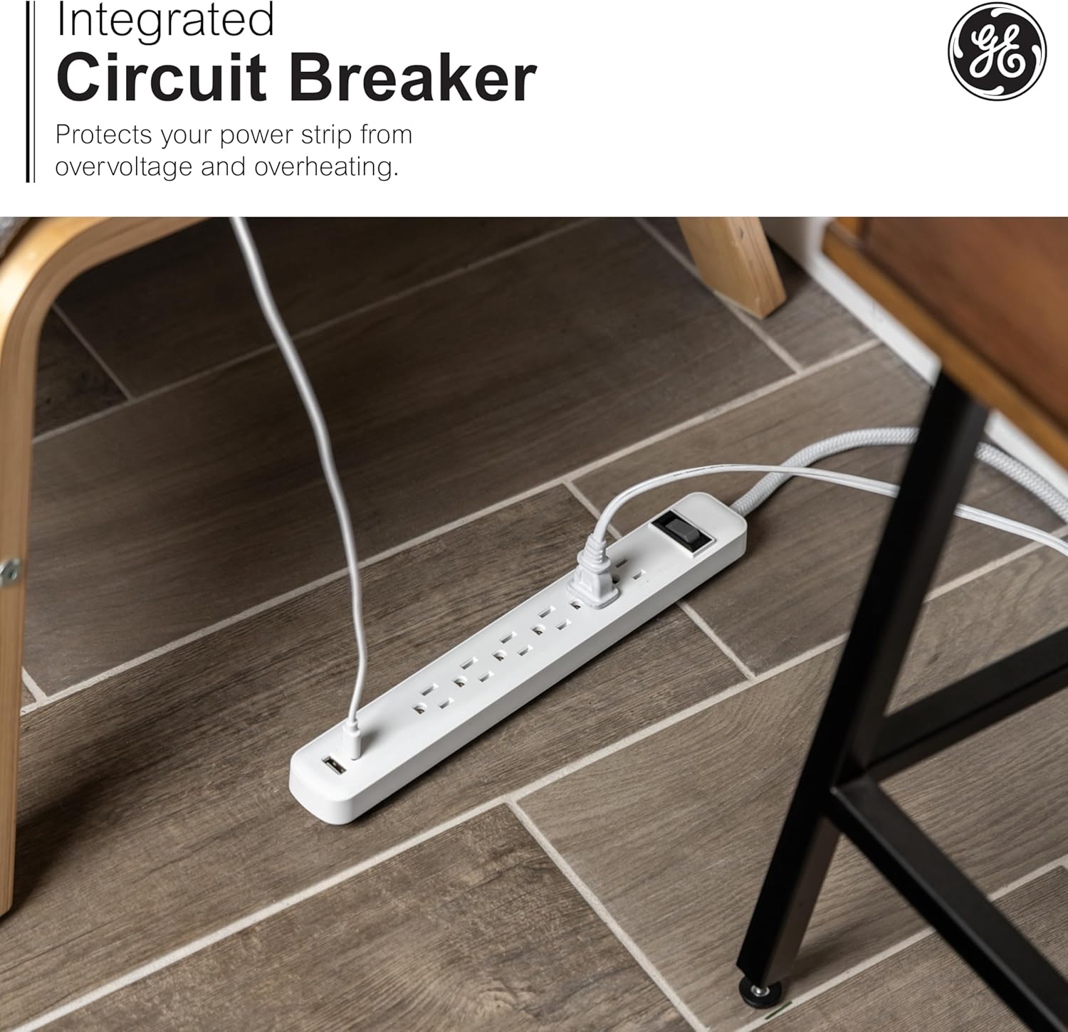 GE 6-Outlet Power Strip with USB, 1 USB-A & 1 USB-C, Outlet Extender, 6 Ft Braided Extension Cord, Flat Plug, Charging Sta...