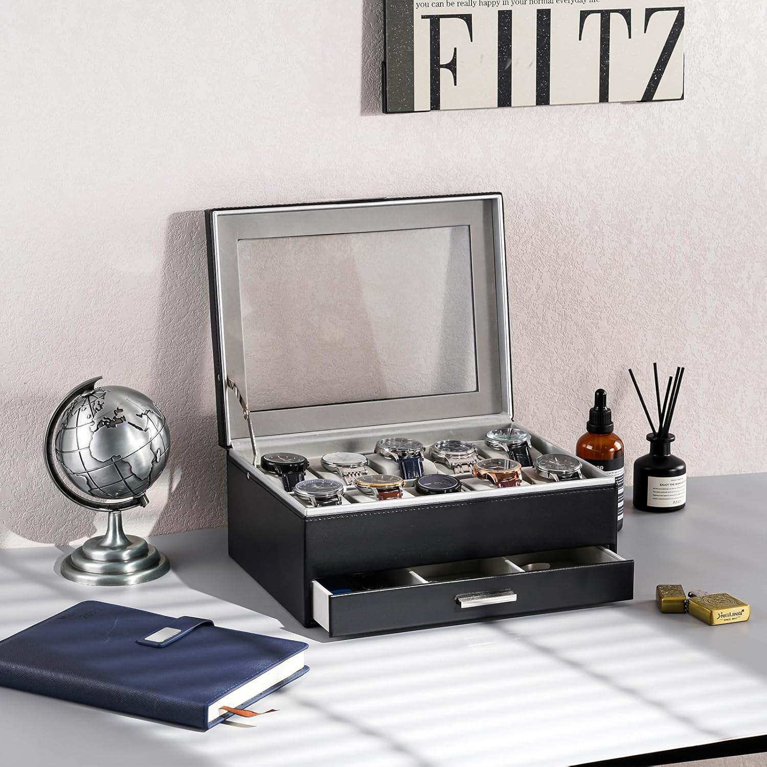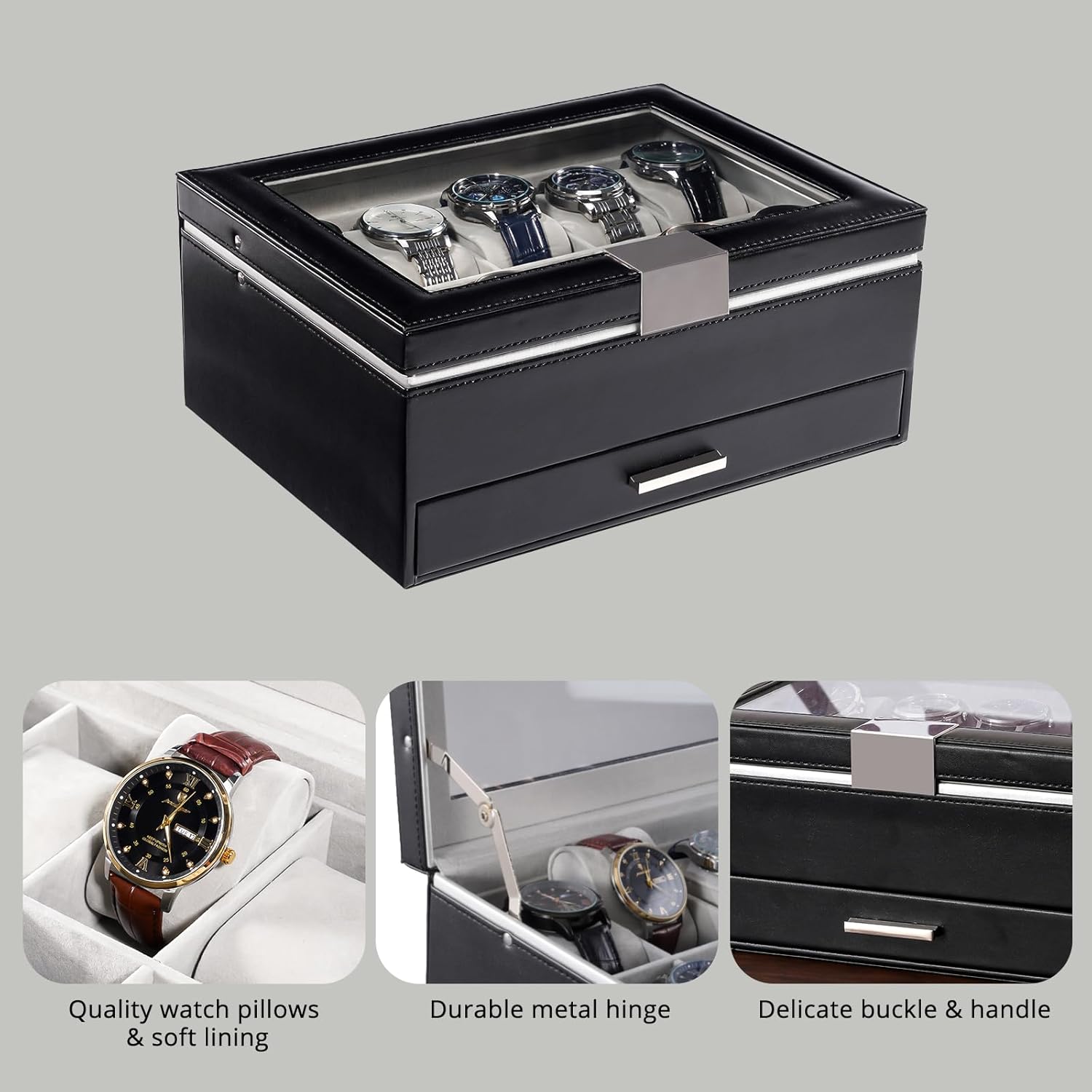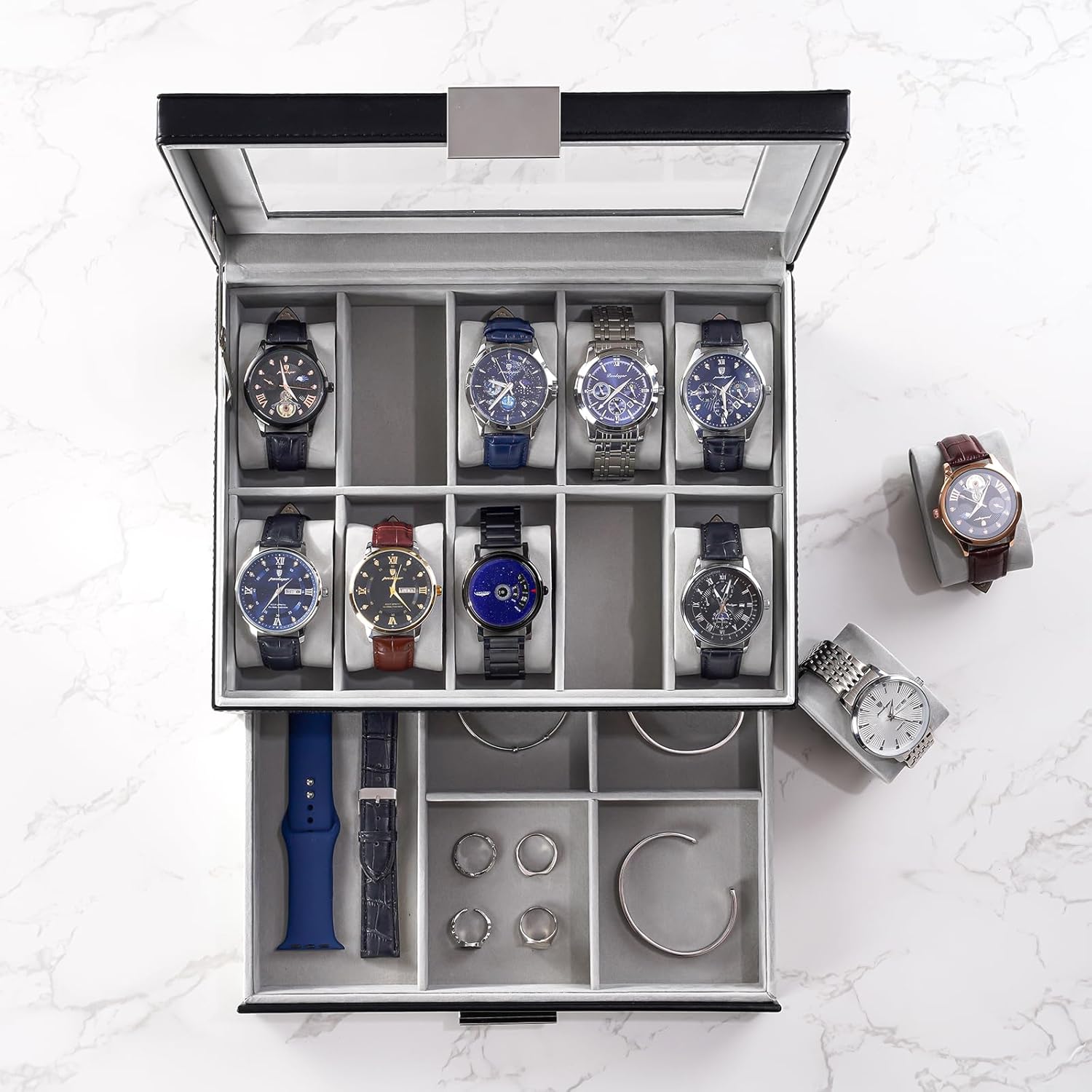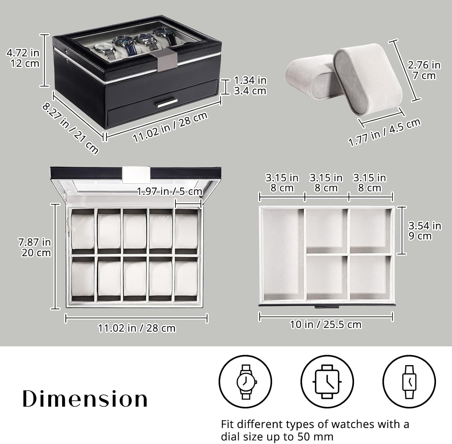Keep All Things in One Place: The design of 2-layers with drawer can store 10 watches, also offers additional storage for watchbands, cufflinks, bracelets, rings, pens, necklaces, and other jewelry; protecting them against dampness, friction and loss