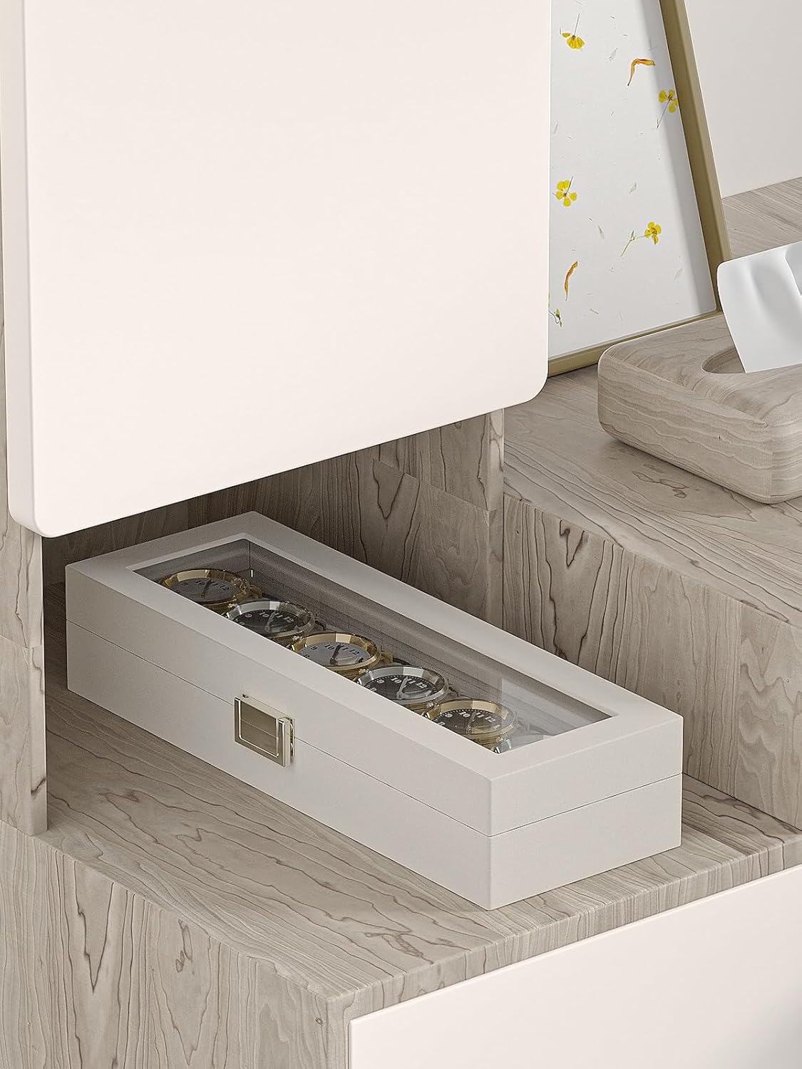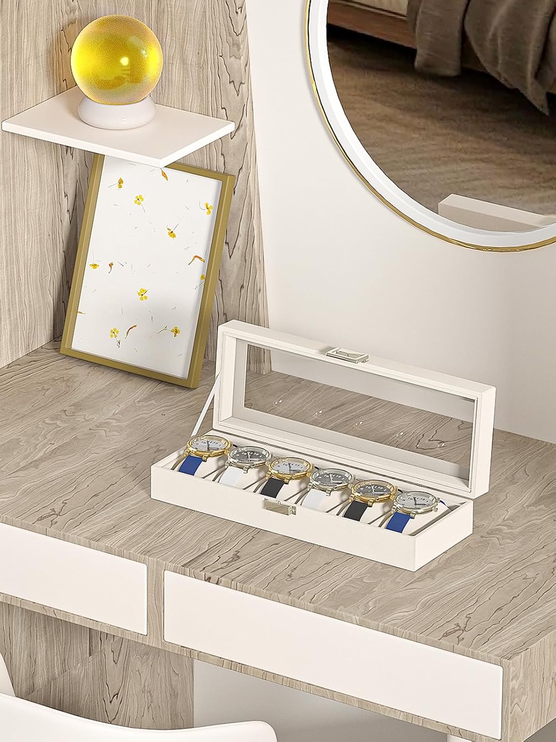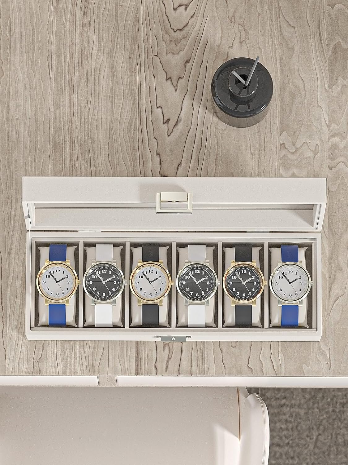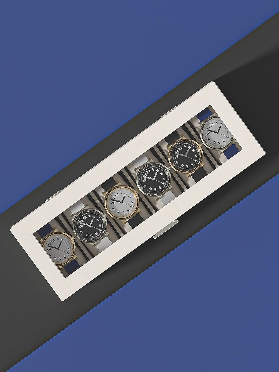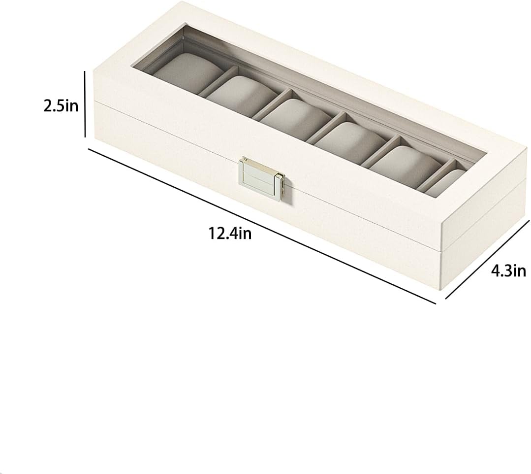 This watch box features a large clear glass lid that allows you to find the right watch at a glance. Each compartment has enough space to hold different types of watches with dial sizes up to 1.8 inches and is durable and easy to clean!