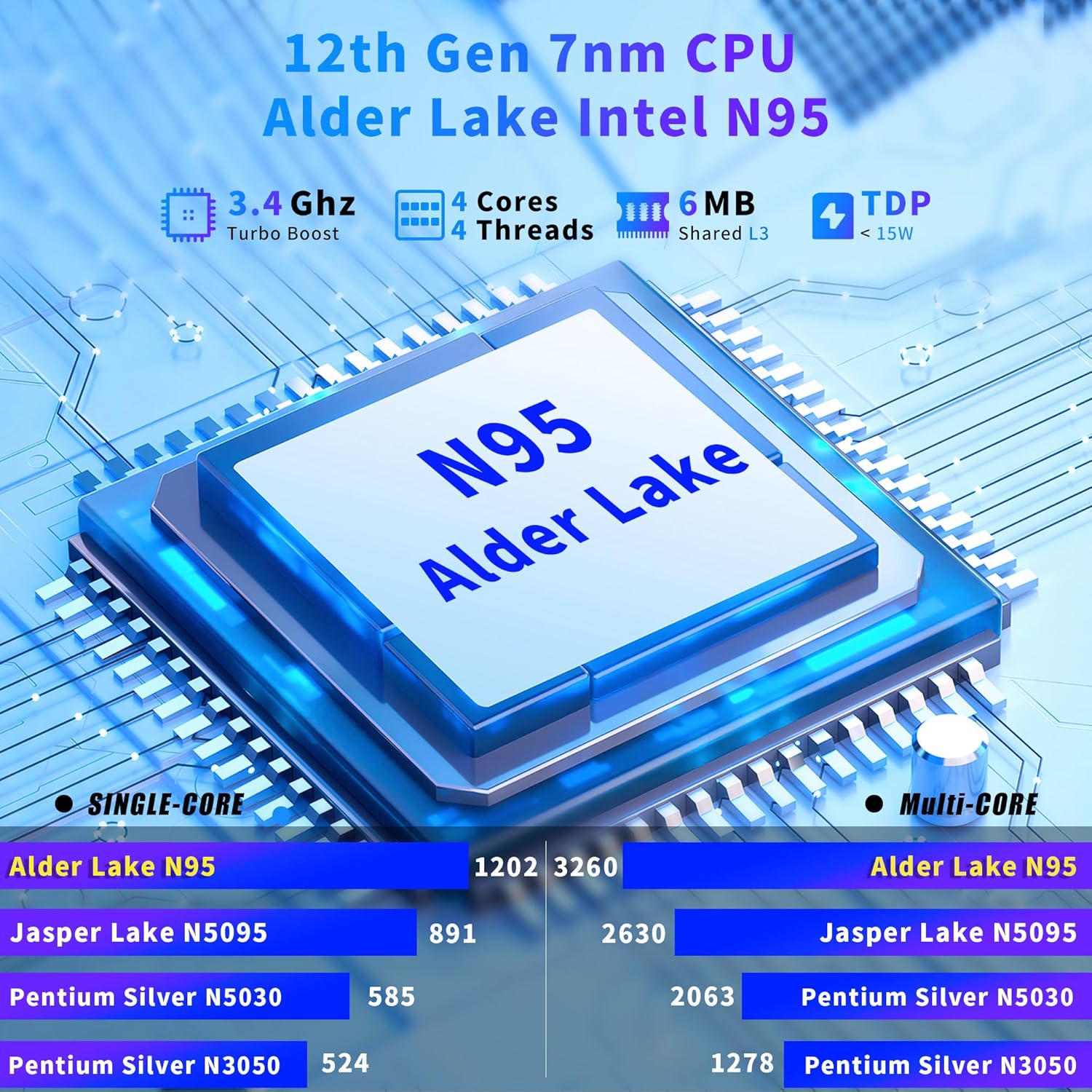【Powerful Processor】Equipped with Intel 12th Gen Celeron N95 processor (4 cores, 4 threads, frequency up to 3.40GHz, L3 Cache: 6 MB) and integrated Intel UHD Graphics (Up to 750MHz). Allow Efficient multitasking with Windows 11 pro system. Powerful and faster than normal processors on the basic frequency.
