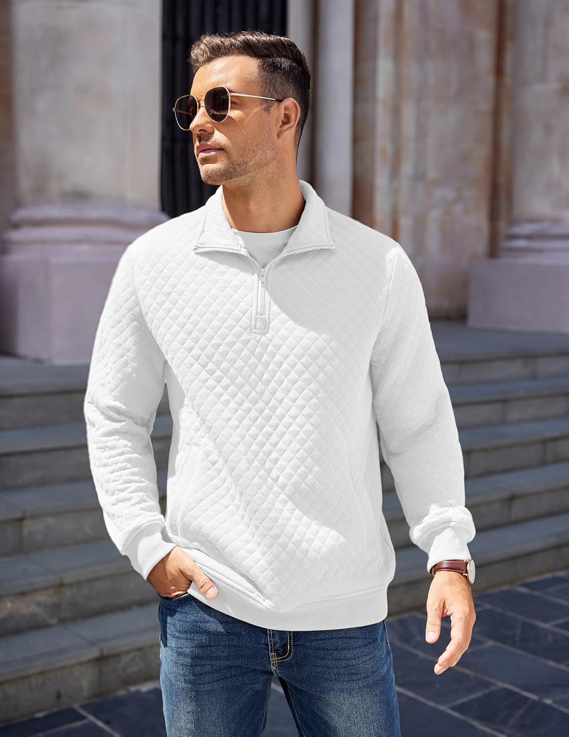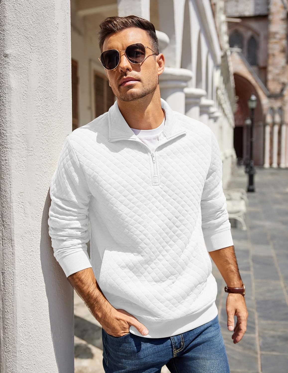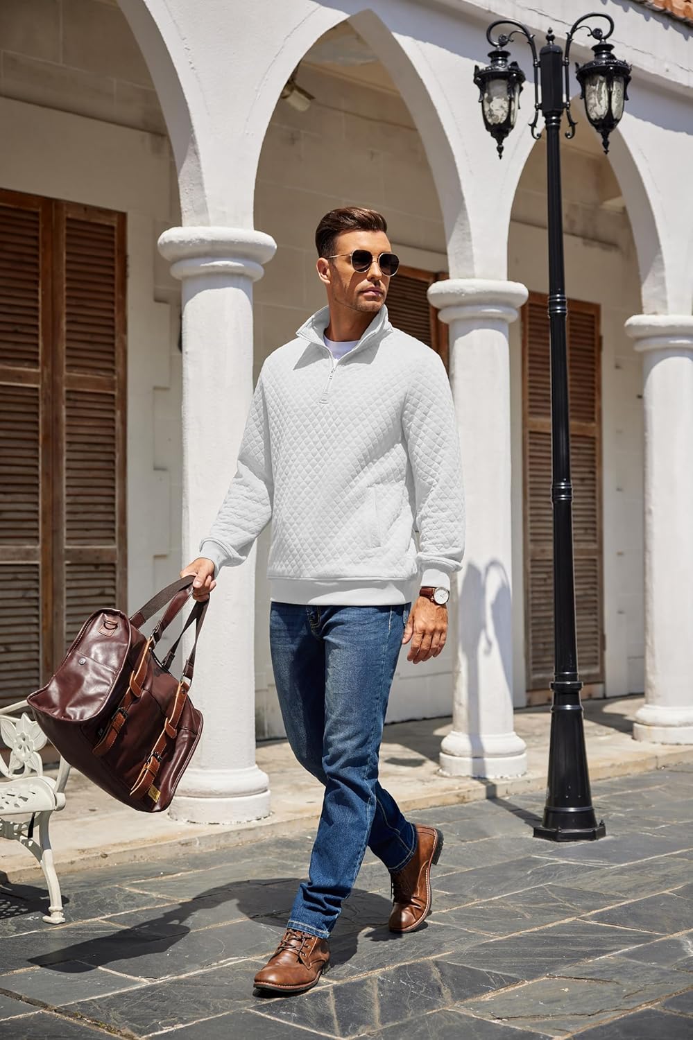 【FEATURES】: Men's quarter zip polo comes with a classic zip up closure, modern quilted pattern. The ribbed cuffs and hem ensure a secure fit. Mens quarter zip sweater includes a kangaroo pocket to hold small items like keys, phone, wallet, etc.