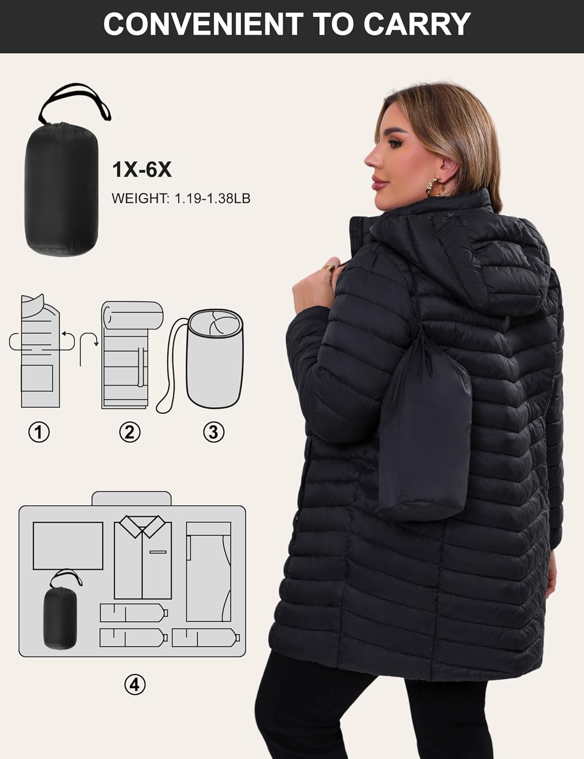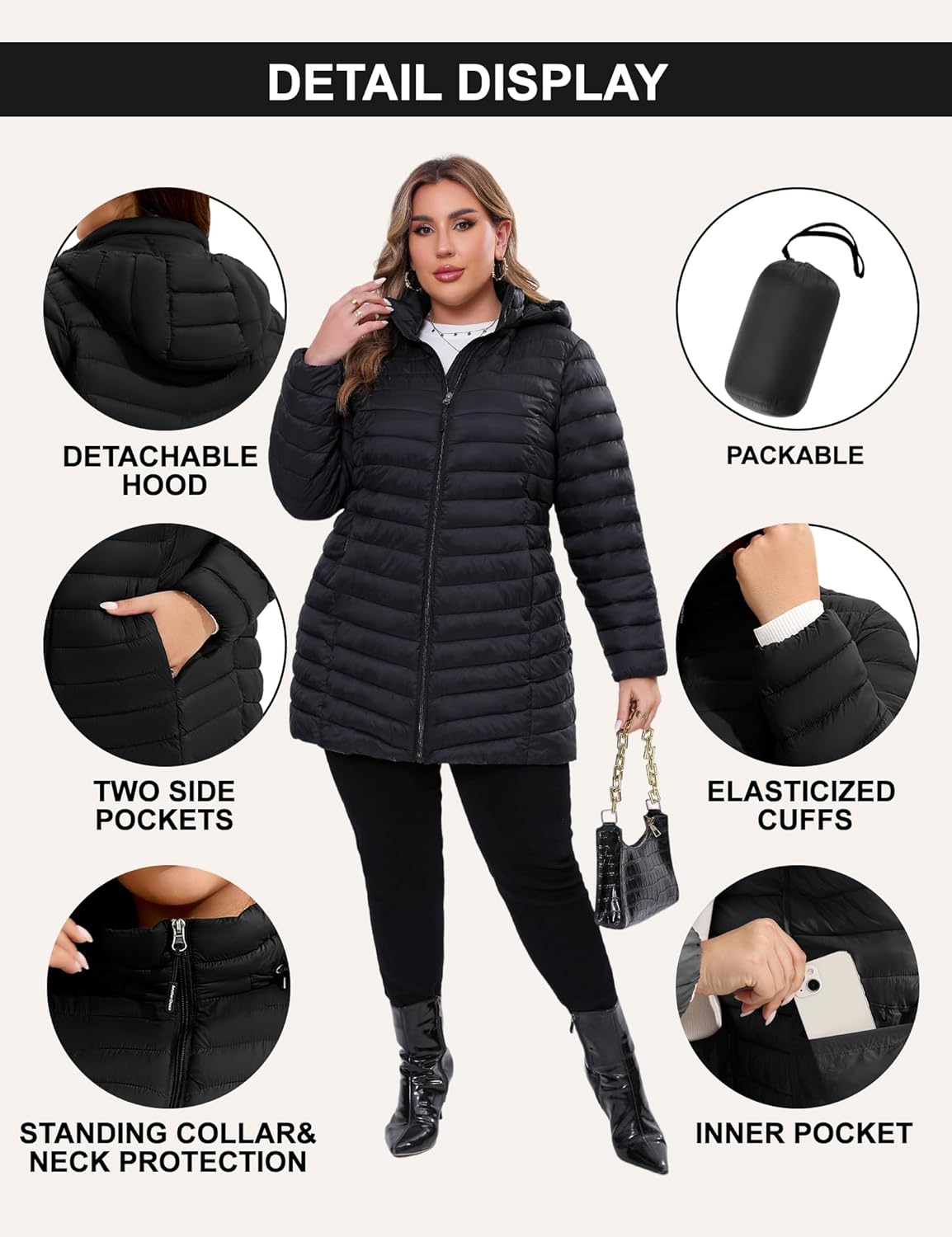 Size:Discover our meticulously crafted thigh-length puffer jacket, designed specifically for the plus-size demographic. Consult our size chart for precise fitting