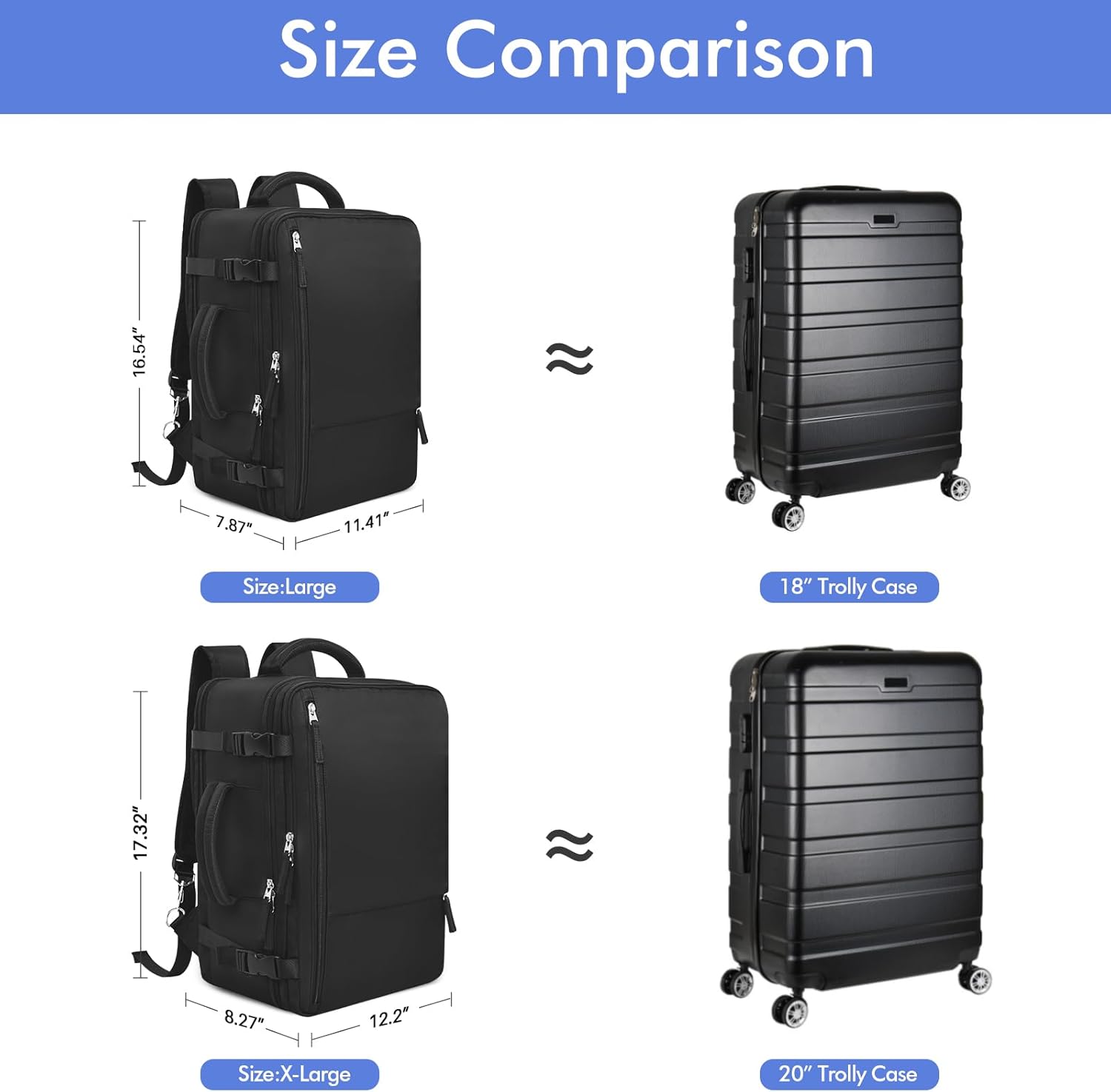 【Large Capacity and Multi Pockets】Carry on backpack with large storage capacity and two extra toiletry bags. Multiple zippered pockets give you plenty of storage space, including a front pocket, waterproof section, main compartment, separate laptop compartment, and anti-theft pocket on the back. In addition, this traveling backpack also has a mesh slip-in pocket with elastic closure on the left side for a bottle or an umbrella