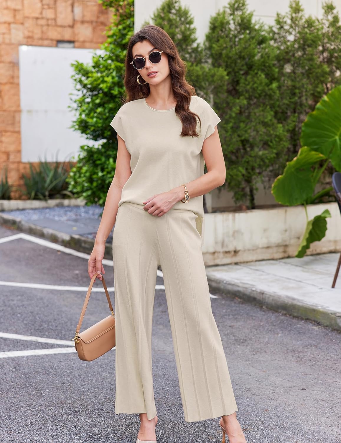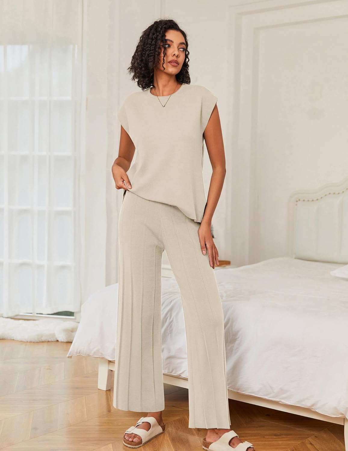 Ekouaer Lounge Sets for Women Two Piece Outfits Knit Cap Sleeve Tops Wide Leg Pleated Pants Casual Dressy Sweater Sets