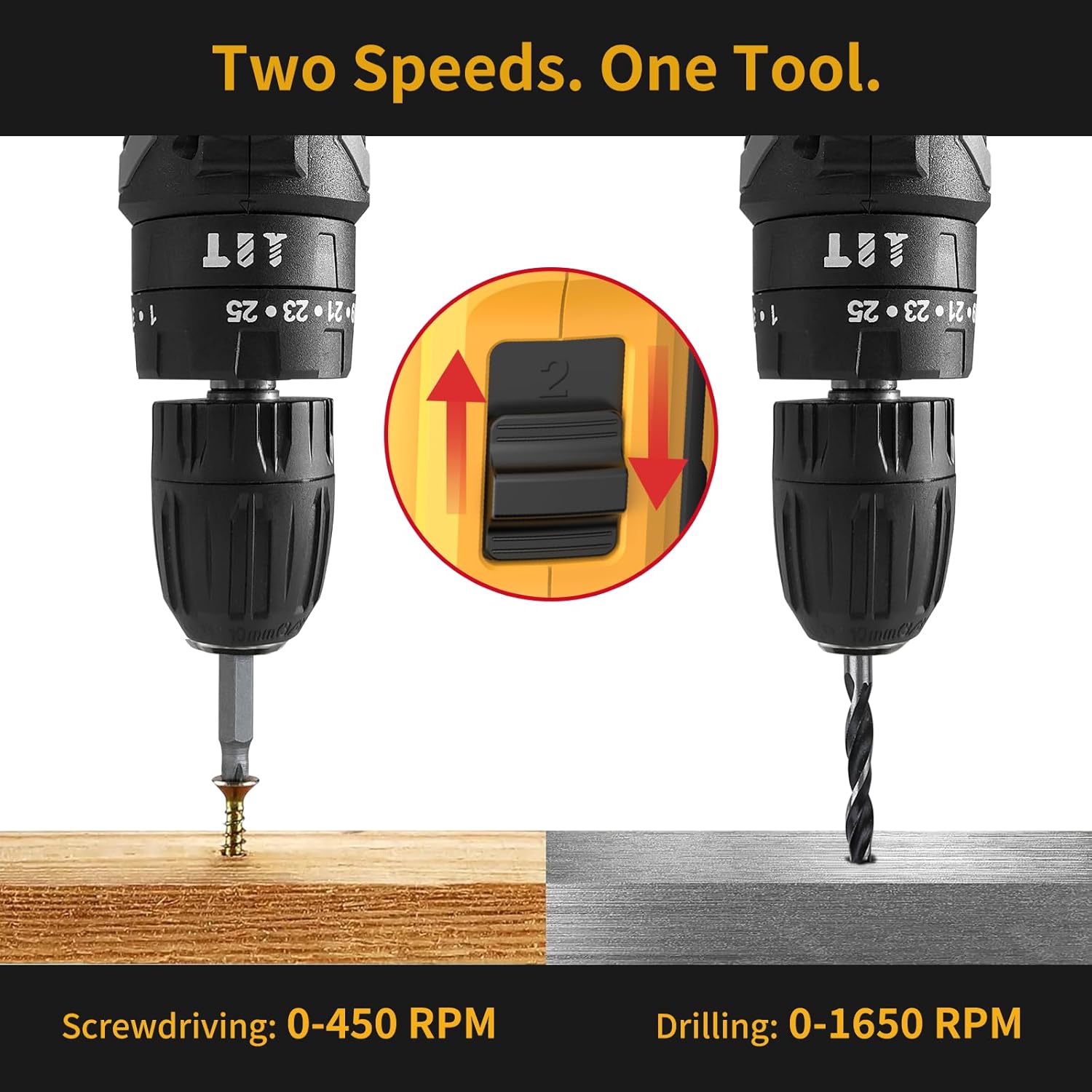 【PRECISION CONTROL】With its 2-speed gearbox (0-400/0-1650 RPM) and 25+3 torque settings, This Cordless electric drill set ensures optimal control for every application, whether you're drilling or screwdriving.
