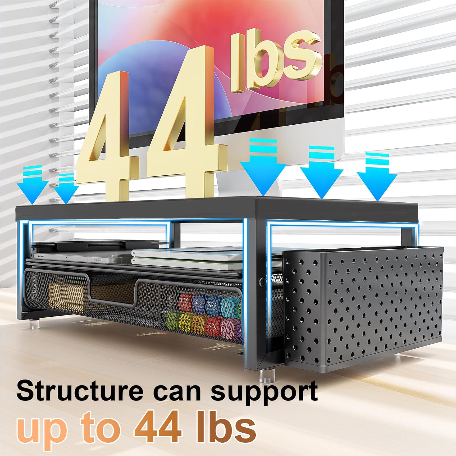 【Multi-Storage Compartments】This dual-tier monitor stand with 2 pen holders offers ample storage space for office supplies. The built-in drawer effortlessly organizes office desk accessories, helping maintain a clutter-free workspace while boosting your productivity focus.