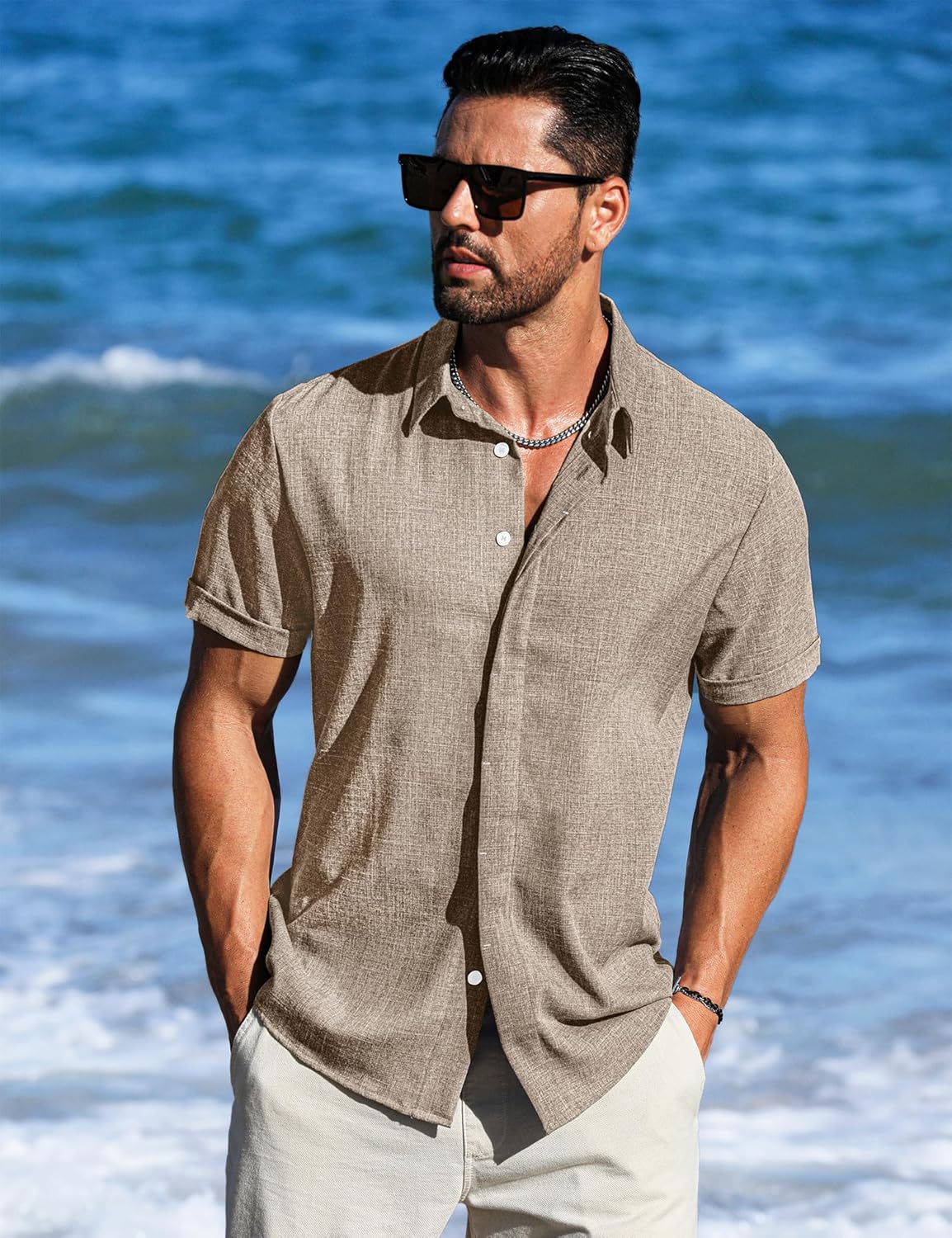 LETSEE Men's Linen Shirts Short Sleeve Button Down Casual Dress Shirts for Men Beach Vacation Shirt Fashion Summer Clothes