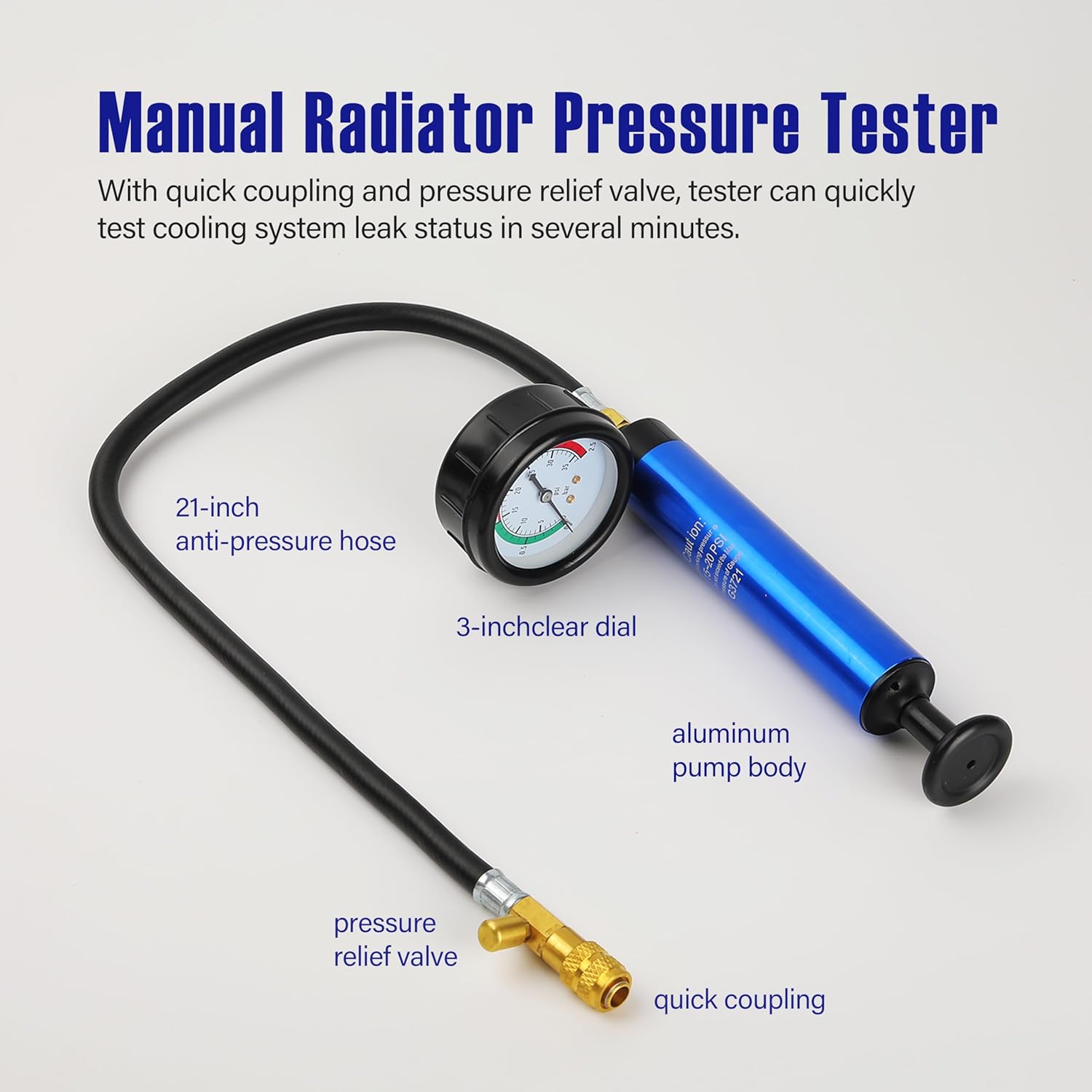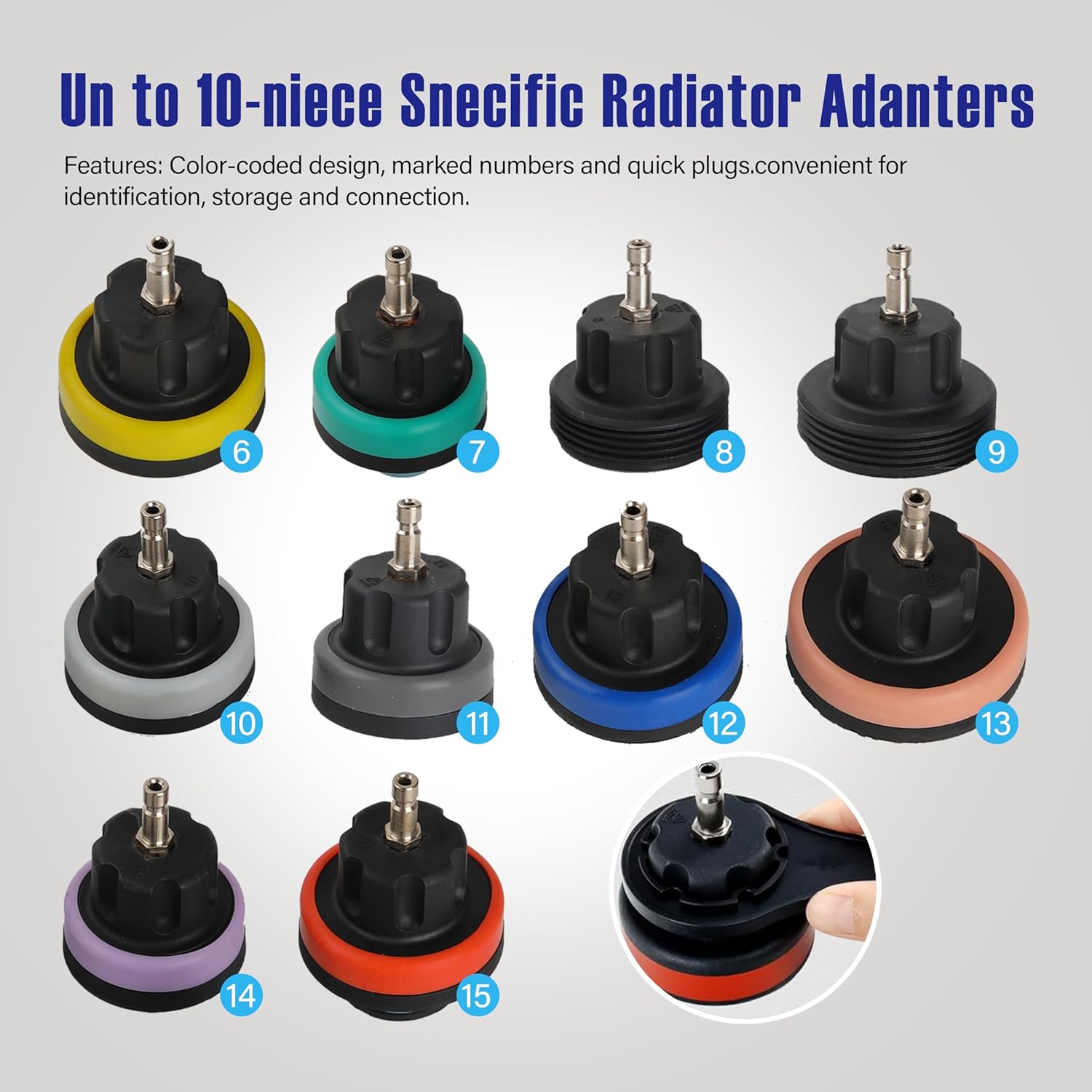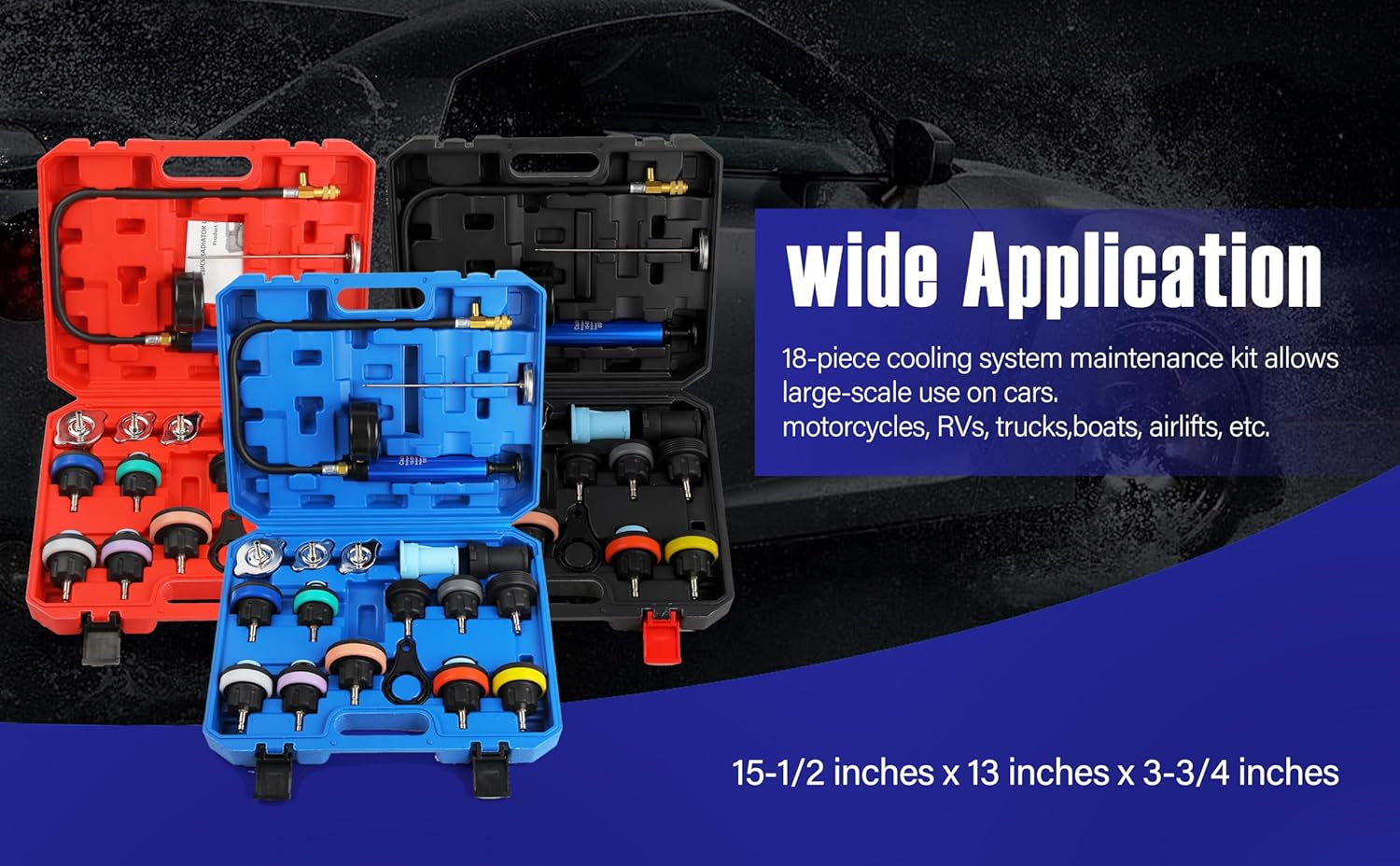 [Complete specifications]: color-coded coolant pressure tester kit make it easy for you to choose the right test cap for your work without causing confusion. The 18pcs radiator pressure tester kit is suitable for testing the cooling system of most cars. It is equipped with a coolant replacement system to help you easily replace the old coolant.