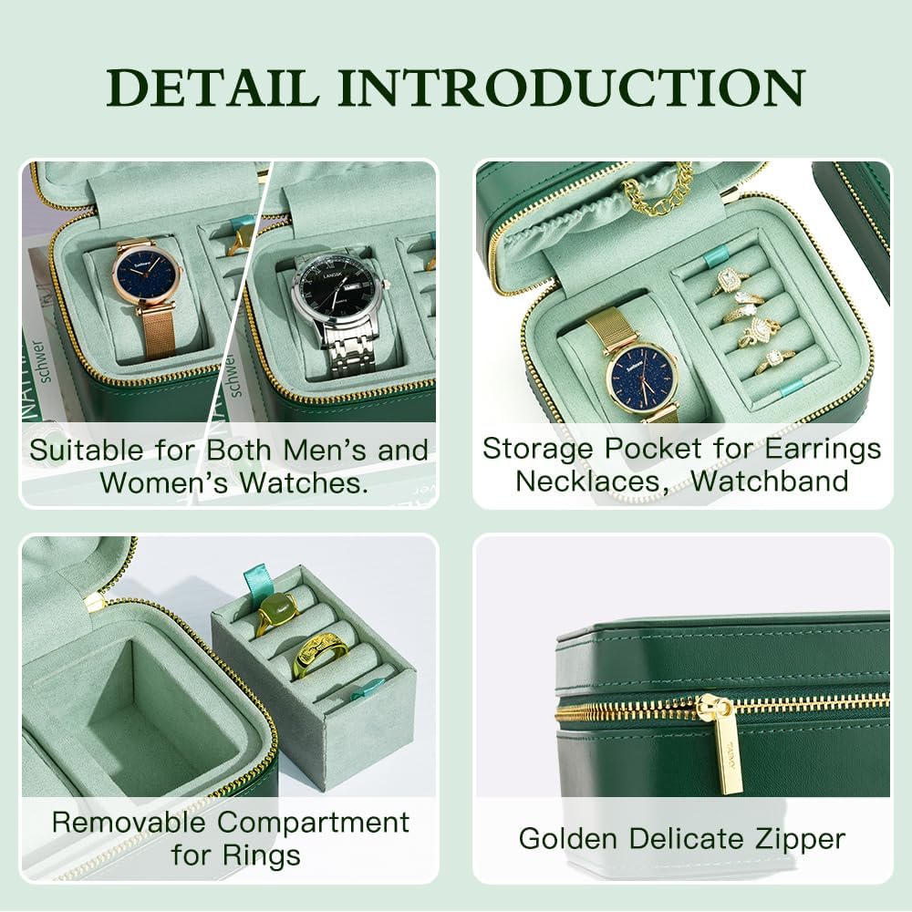 SAFEKEEPING YOUR JEWELRIES: The watch box comes with 1 slot roll specifically designed for your watch, ensuring it stays secure and organized. Additionally, there are 5 slot rolls for your rings, providing separate and dedicated spaces for each one. The pockets of this case are versatile and practical. You can easily store your earrings, necklaces, and watch straps.