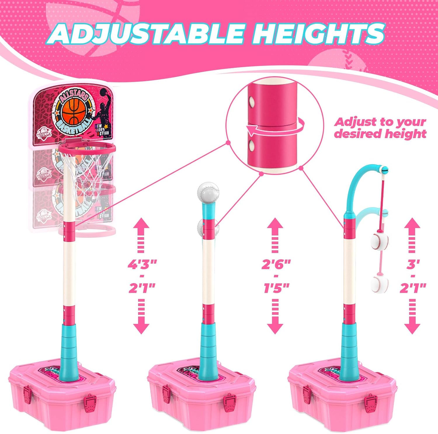 Easy to Assemble: This 5 in 1 kids' basketball hoop and T-ball set includes 1 basketball hoop, 1 inflatable mini soft basketball, 1 ball pump,1 stretchable bat,6 baseballs,1 step-on pitching machine, and all needed tools. You can easily complete the assembly and play immediately! No extra tools! Have a great time with these basketball and baseball toys immediately
