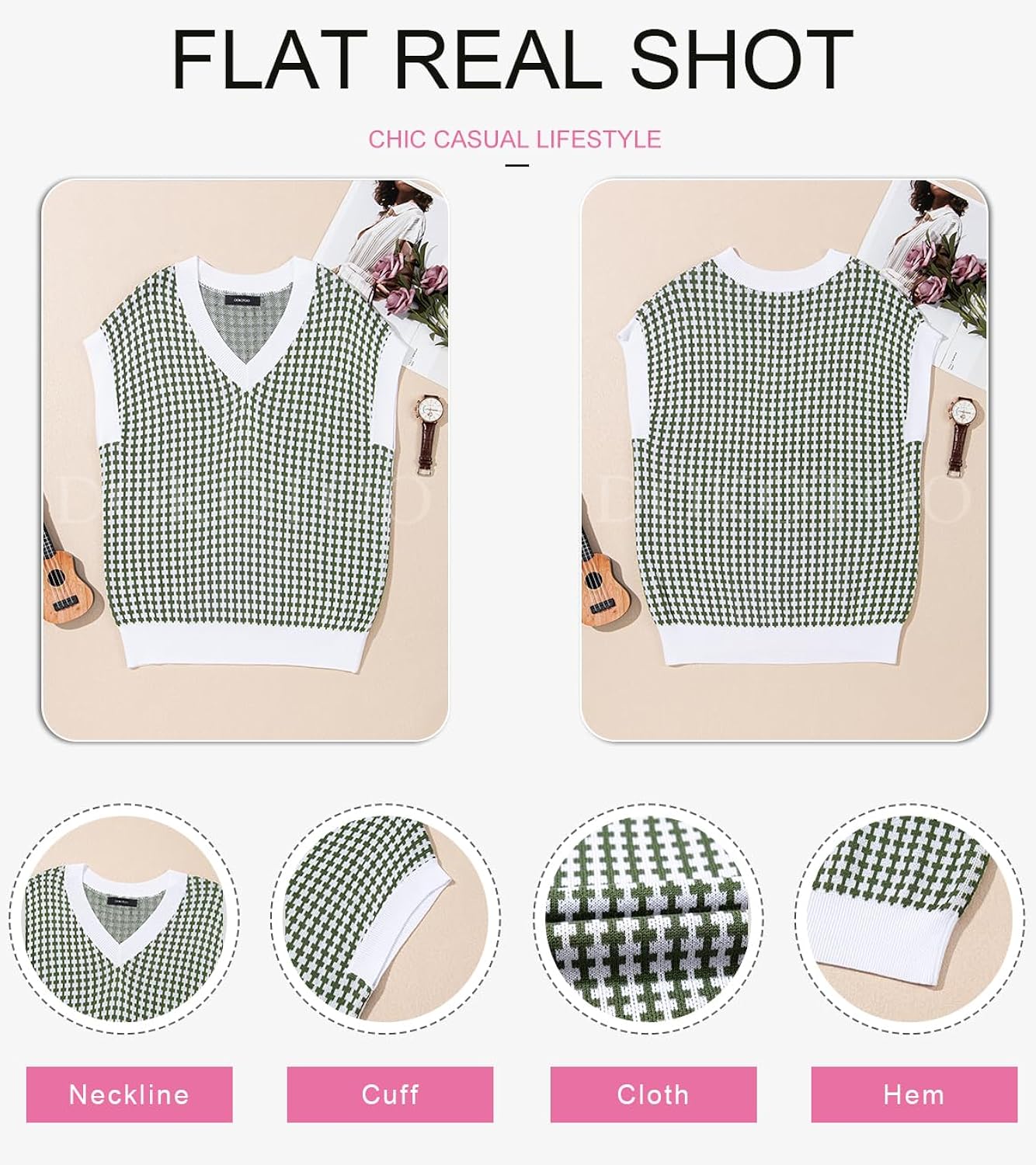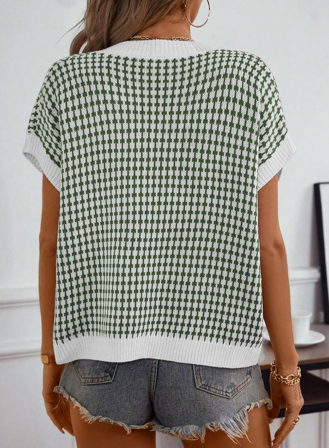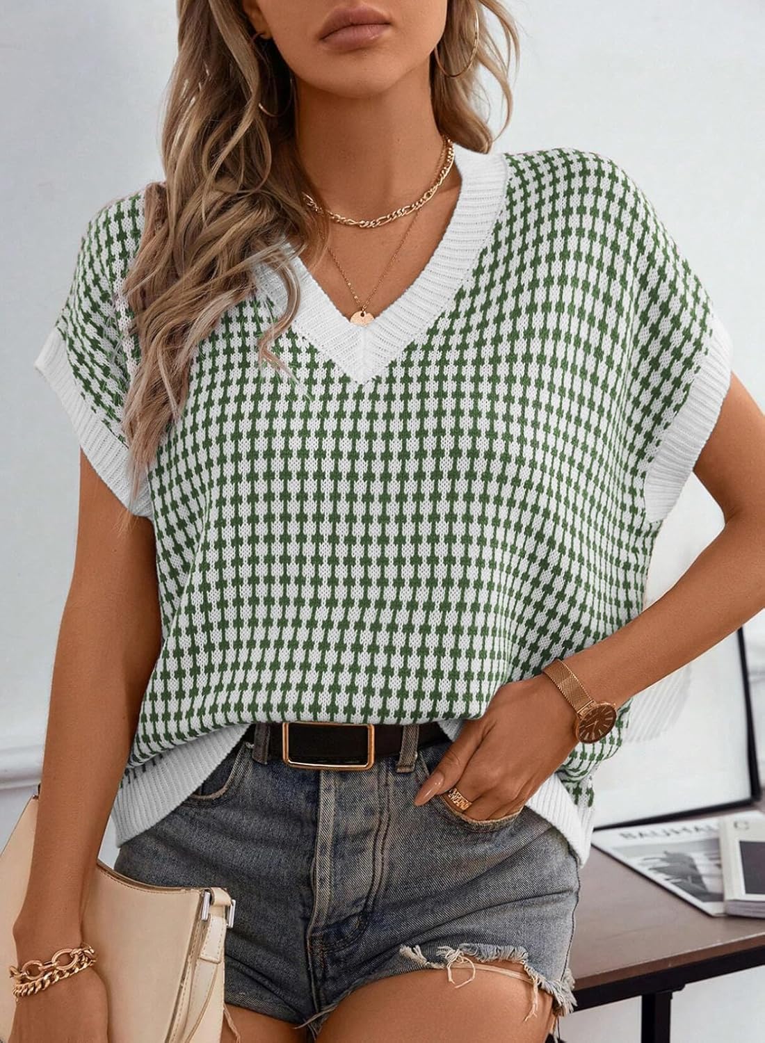 Dokotoo Womens Casual Summer Tops V Neck Short Sleeve Plaid Knit Vest Loose Fit Pullover Sweaters Blouses