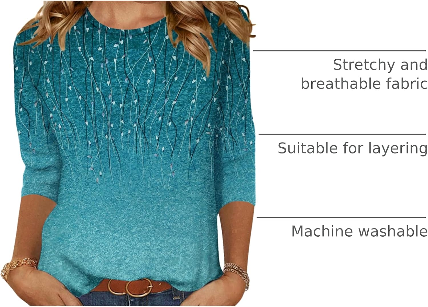 Soft comfy material: 3/4 length sleeve womens tops is made of 95%Polyester 5%Spandex, which is stretchy, breathable and comfortable