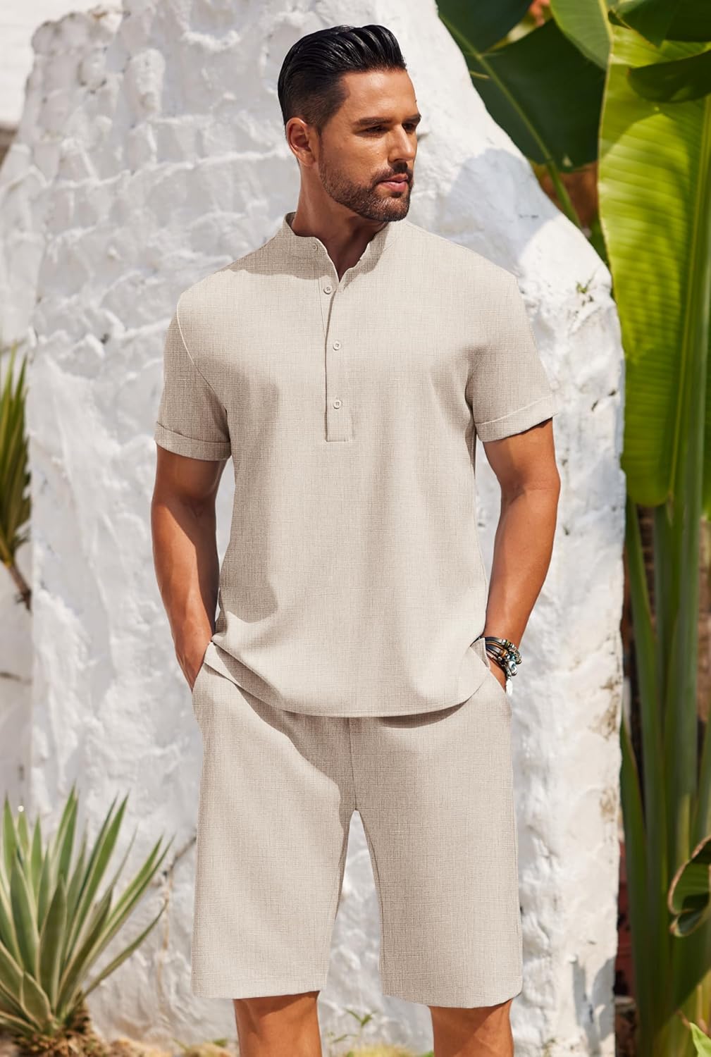 COOFANDY Men's 2 Pieces Set Short Sleeve Henley Shirts and Shorts Pants Texture Summer Beach Vacation Outfits