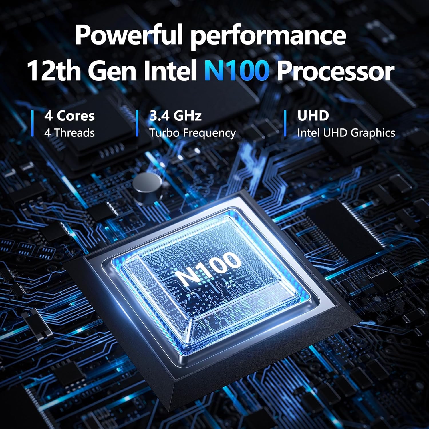 Intel N100 processor (up to 3.4 GHz) with 4 cores and 4 threads.