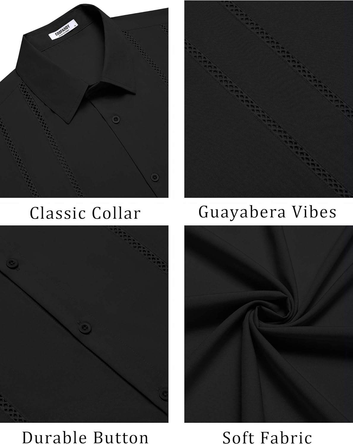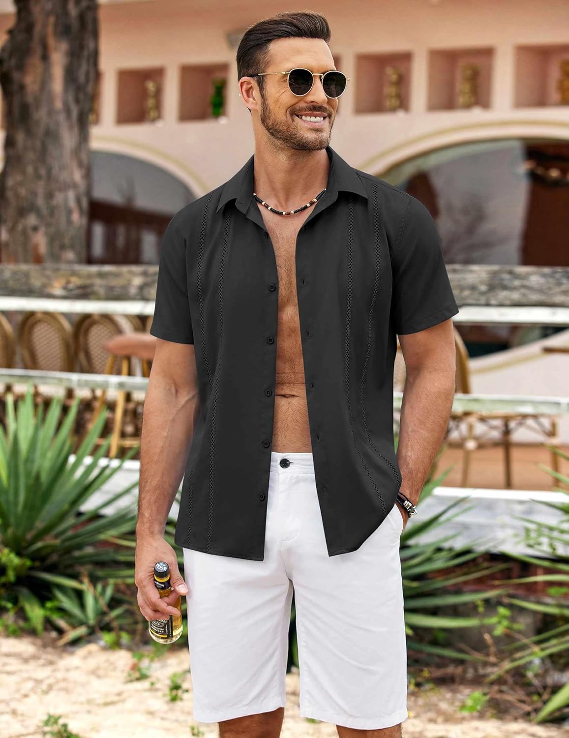 PREMIUM COMFORT - Men's Short Sleeve Cuban Guayabera Shirt. Crafted from premium fabric, this men's Cuban shirt offers a perfect blend of lightweight, breathable, and durable material that keeps you cool and comfortable during the hot summer vacation. The skin-friendly design ensures maximum comfort all day long