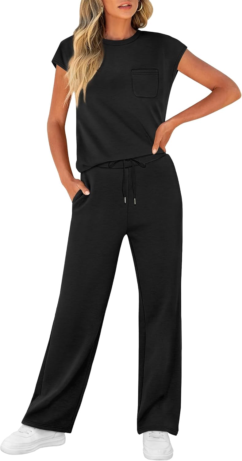 Design: Two piece sets for women crew neck cap sleeve tops,wide leg pants,equipped with convenient pockets, contoured back for the most flattering rear view,elastic drawstring.