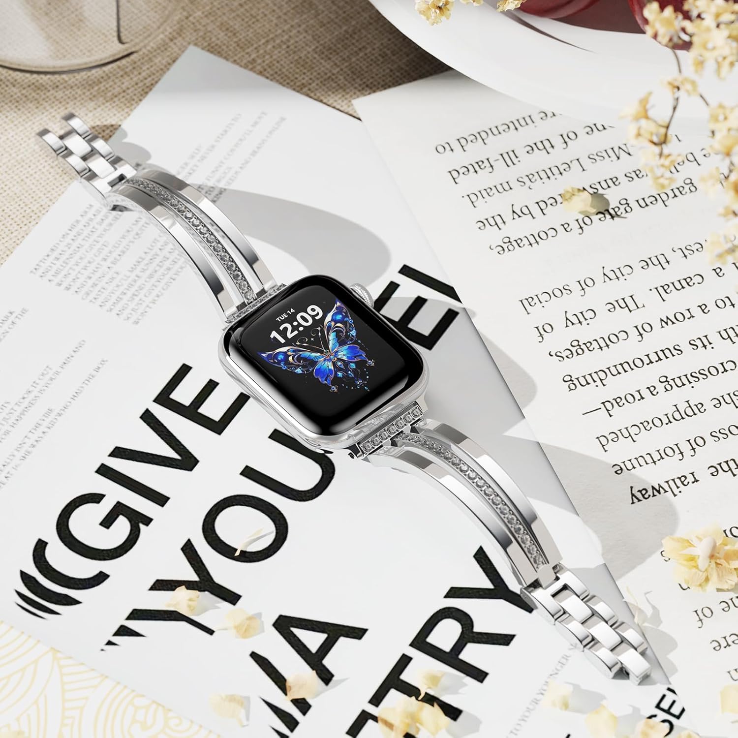 Slim Apple Watch Bands for Women: This dressy apple watch strap is made from durable stainless steel with a brushed silver finish. The thin apple watch bands for women adds a feminine appeal to your wrist. The sparky diamonds lining in the middle are hand-inlaid and firmly embedded to ensure each sparkle shines evermore.