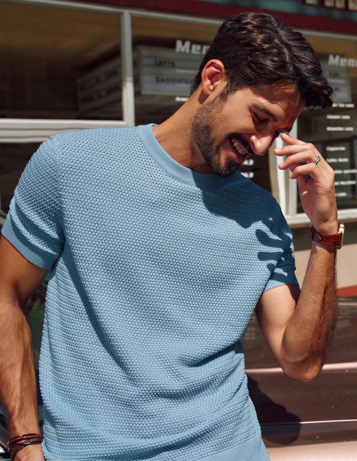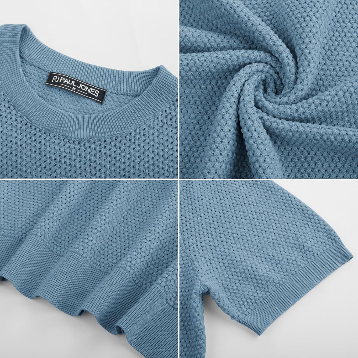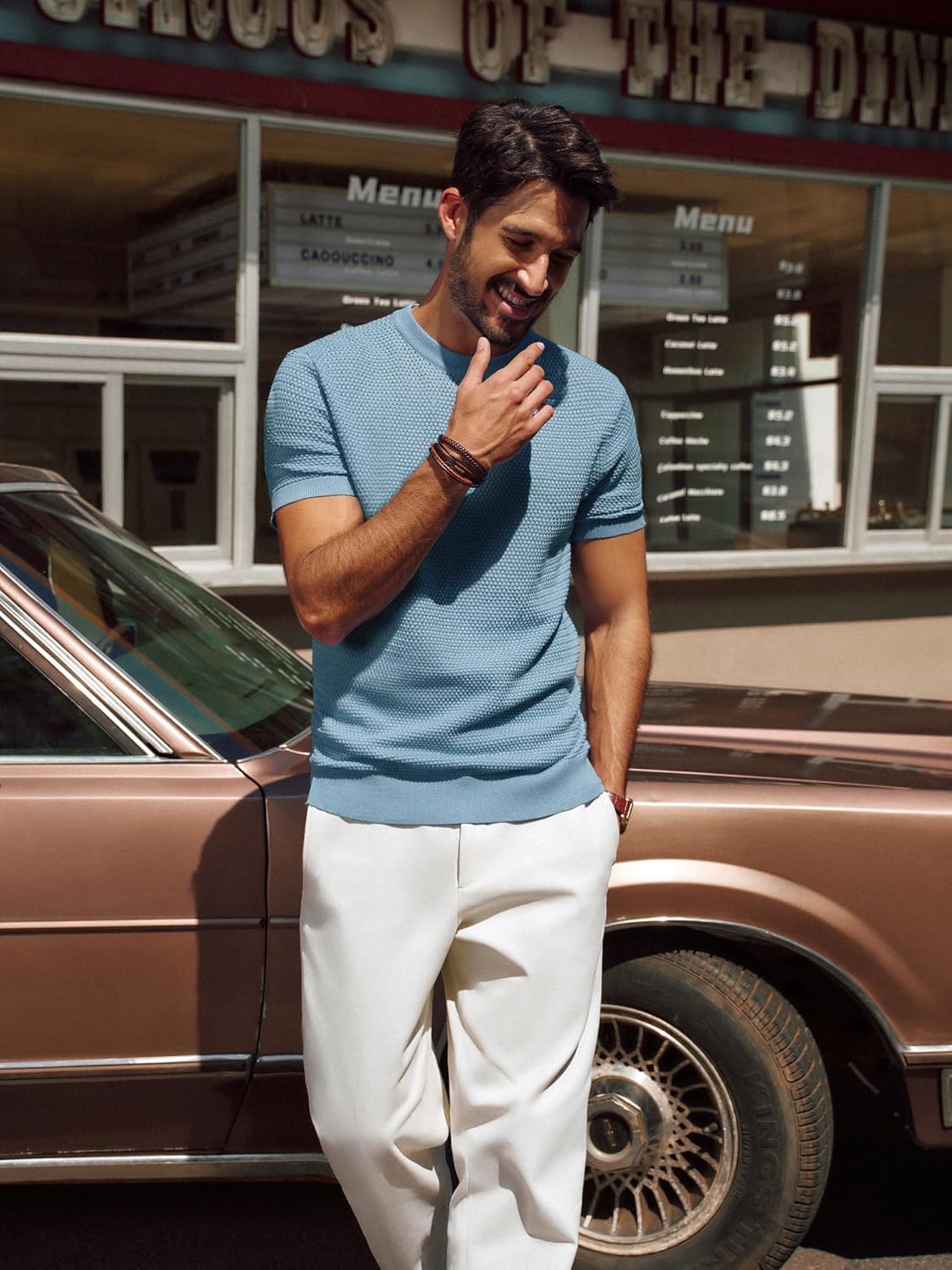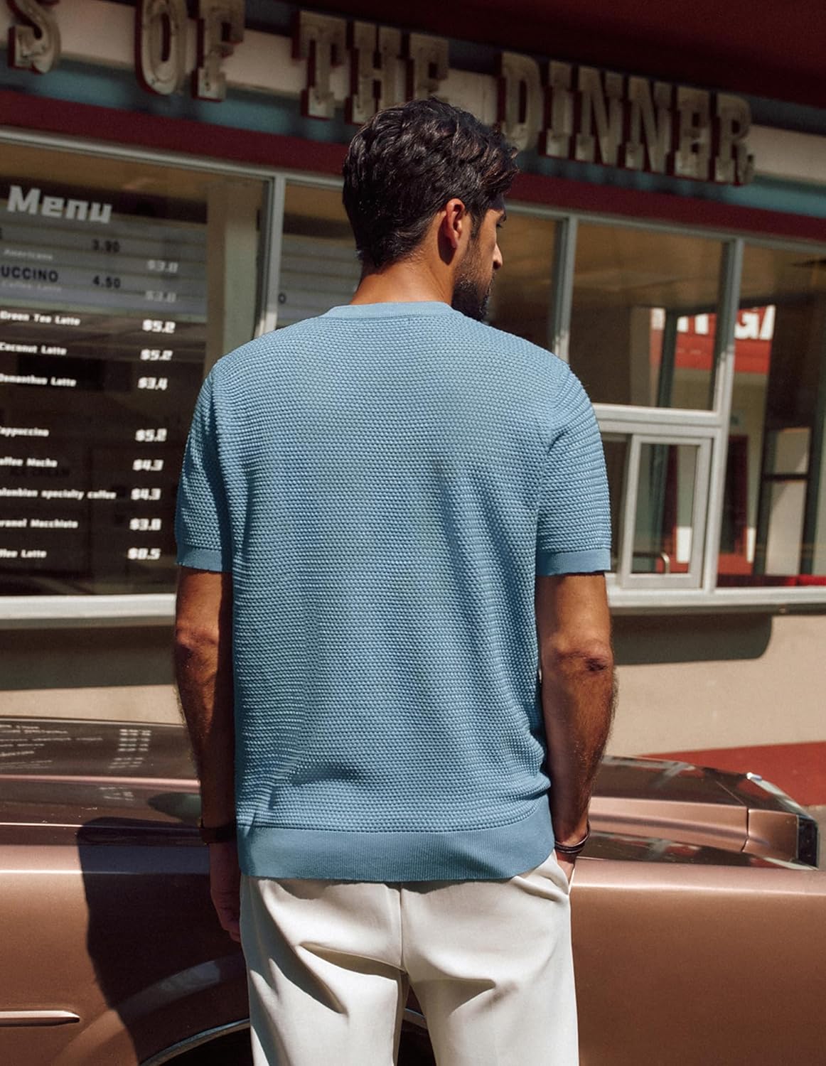 Classic features: Men's lightweight short-sleeved T-shirt, classic round neck, comfortable knitted fabric, fashionable honeycomb waffle texture with ribbed edges. Versatile and durable casual men's T-shirt