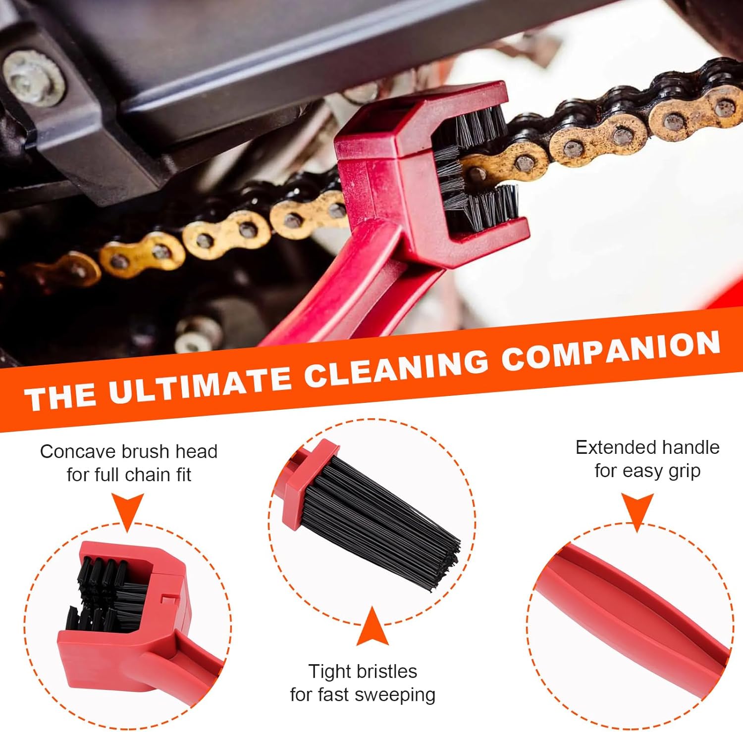 【Excellent Cleaning】: Our cleaning brush has excellent cleaning performance, and a few minutes of cleaning will give your chain a new look. What's more, with its soft and hard bristles, it will not damage the surface of the motorbike chain. With it, you can clean the chain anytime and anywhere.