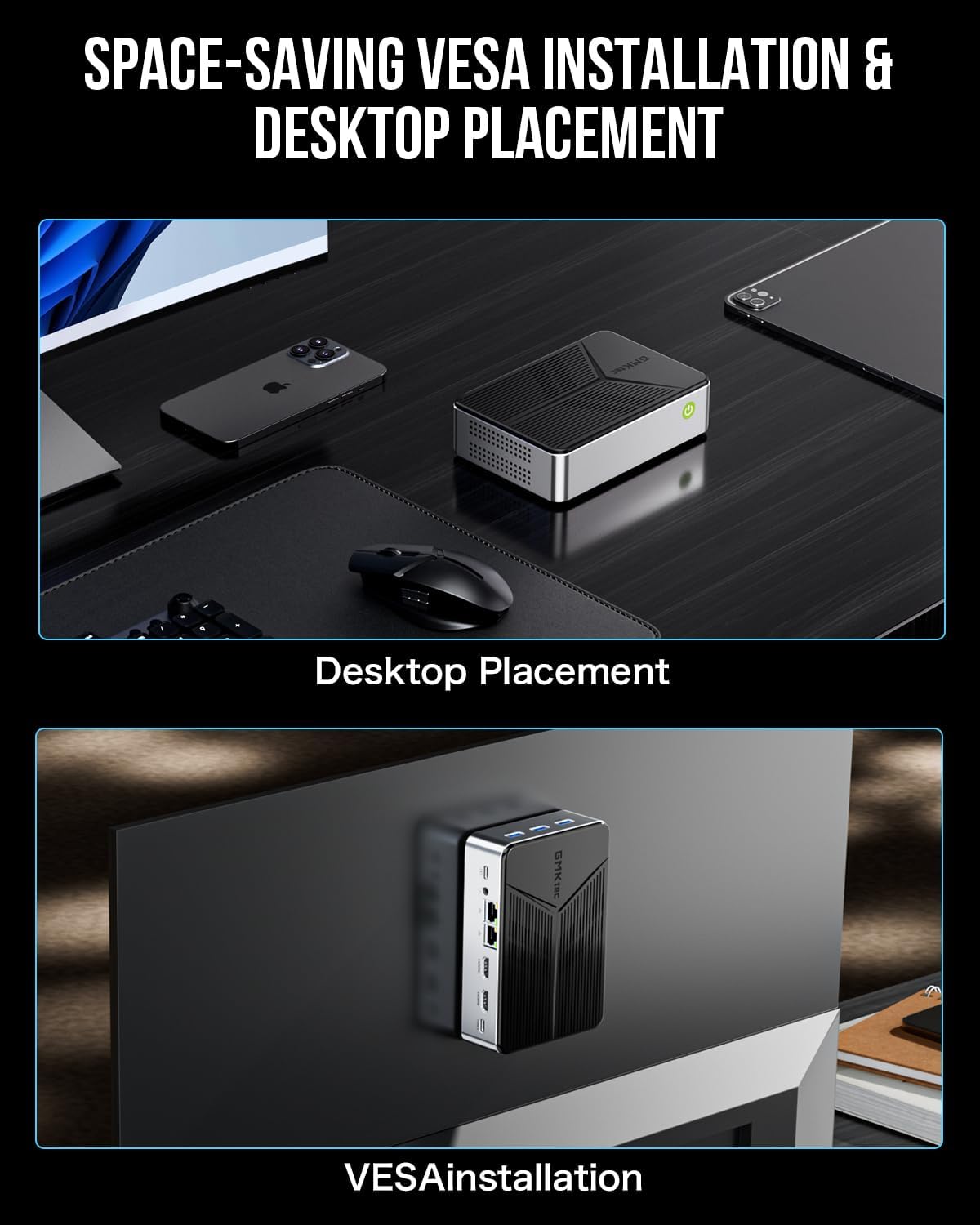 TRIPLE SCREEN DISPLAY - Mini desktop computer is equipped with upgraded Intel Graphics(max 1000MHz), supports 4K video playback and AV1 decoding, connect the pc with a projector as a home theatre, enjoy a variety of entertainments. Two HDMI 2.0 ports + Full Function Type-C port allows you to multi-task efficiently on three 4K@60Hz displays.