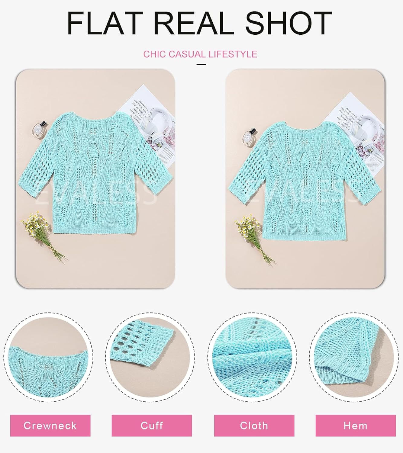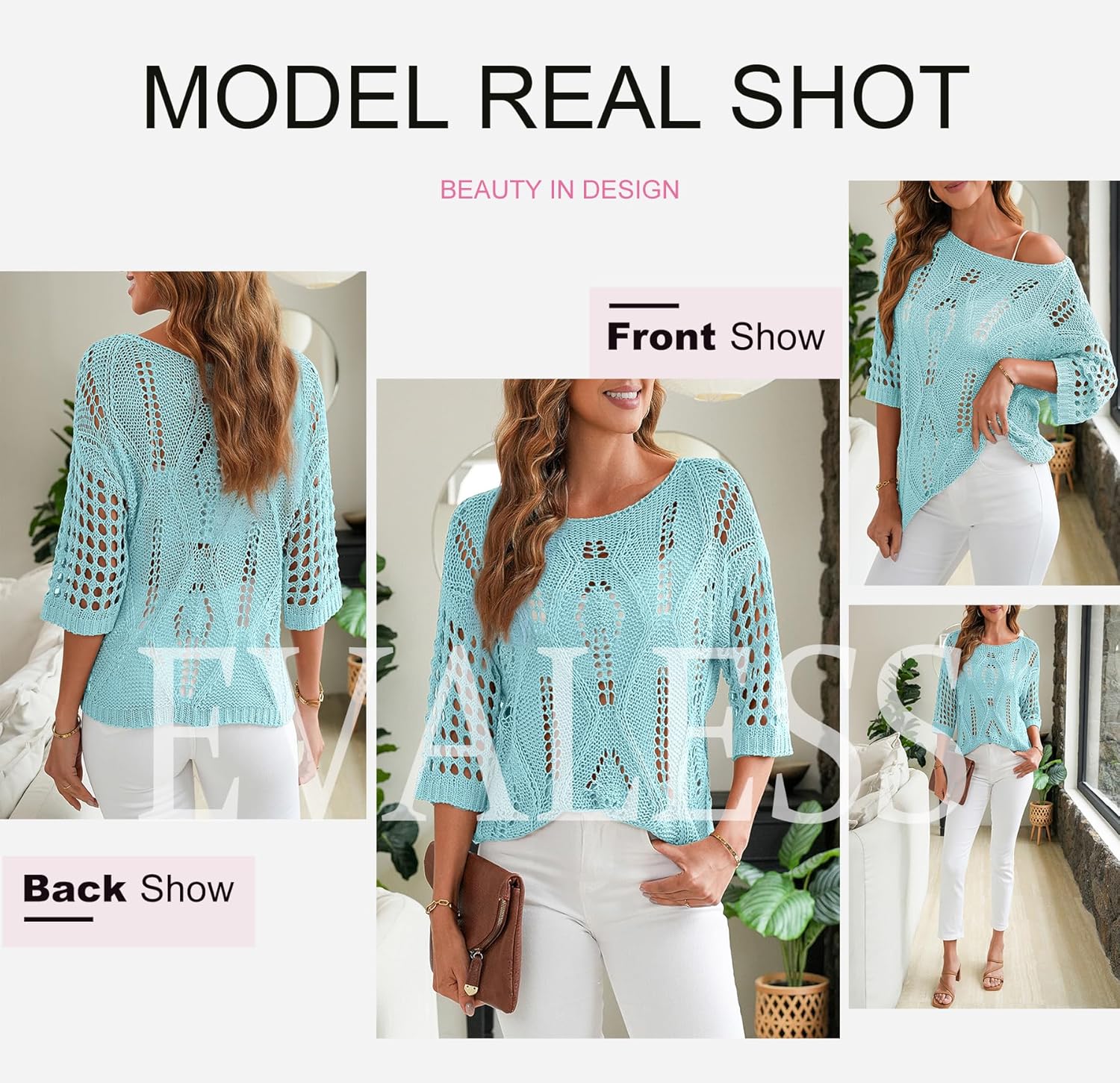 EVALESS Women's 2025 Spring Summer Crochet Hollow Out 3/4 Sleeve Pullover Sweater Off Shoulder T-Shirts Off Shoulder Tops for Women Bathing Suit Cover Up for Women