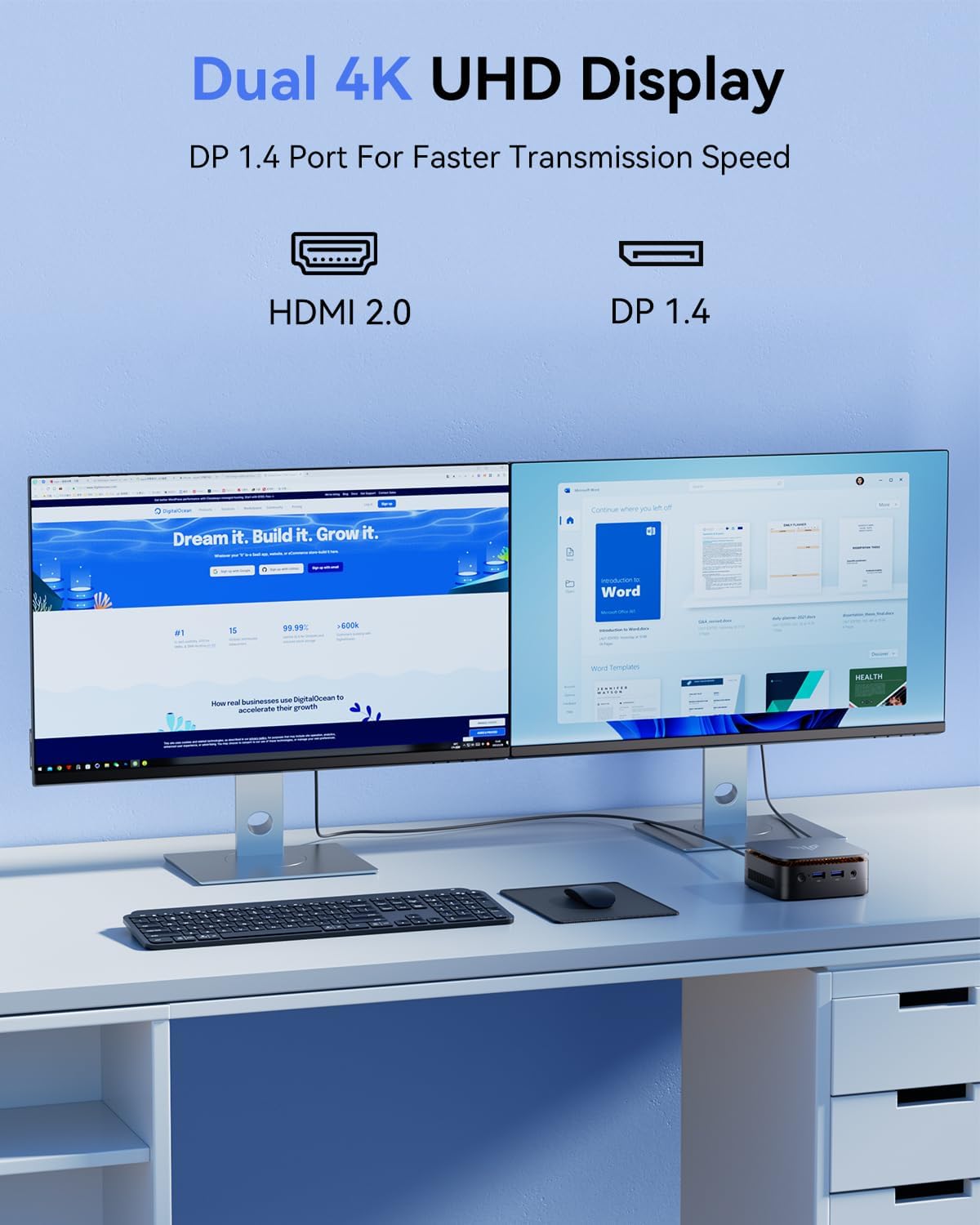 Versatile Ports: This Desktop PC is equipped with Gigabit Ethernet for lightning-fast wired connections. Additional peripheral support is provided through USB3.2 ×2, USB2.0 ×2, HDMI 2.0 ×1, DP1.4 ×1, and a 3.5mm Audio Jack ×1, making it compatible with servers, surveillance devices, and more