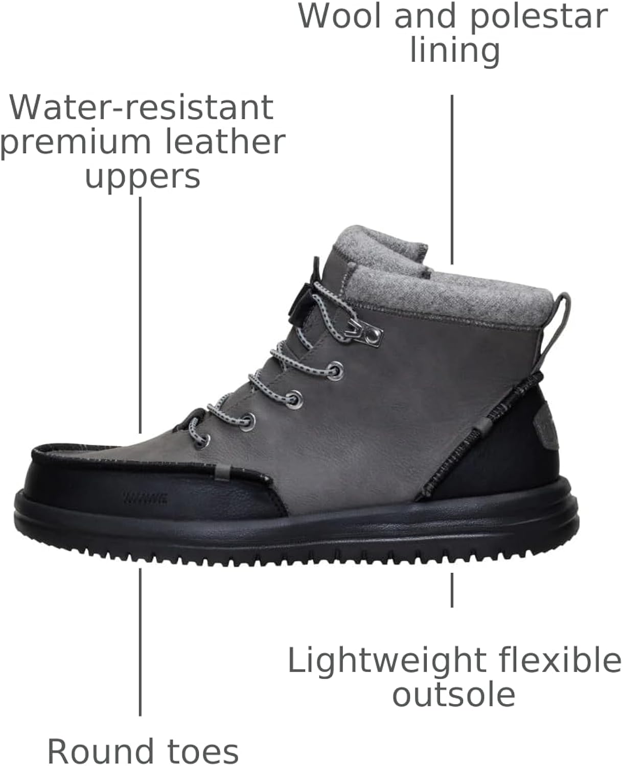 Feet warm choosing the Hey Dude Bradley Classic Tumbled boots. Our easy slip-on system and step out looking fresh, whatever the weather. Water-resistant, premium leather uppers meet our lightweight, flexible outsole for comfy, seasonal style.