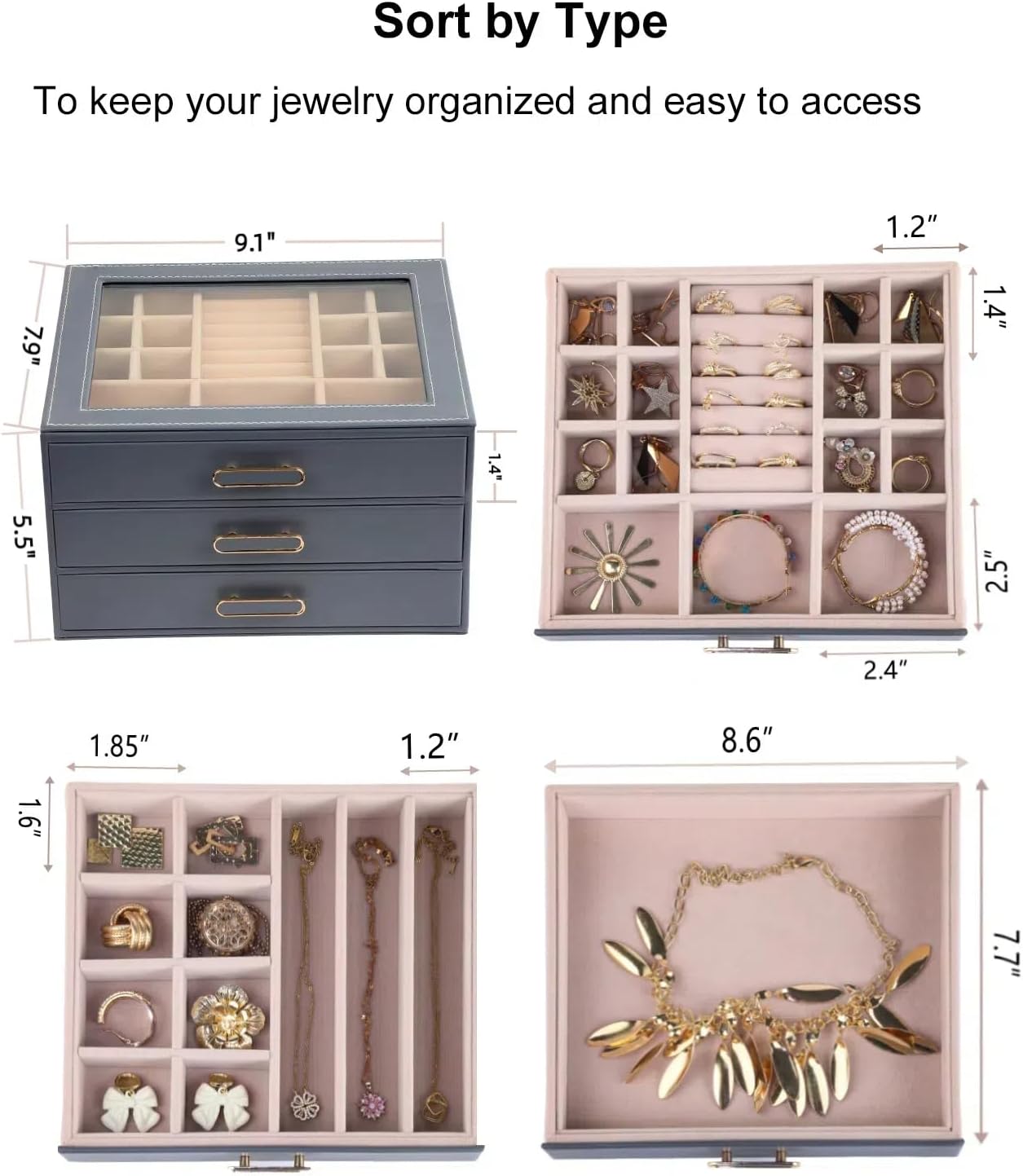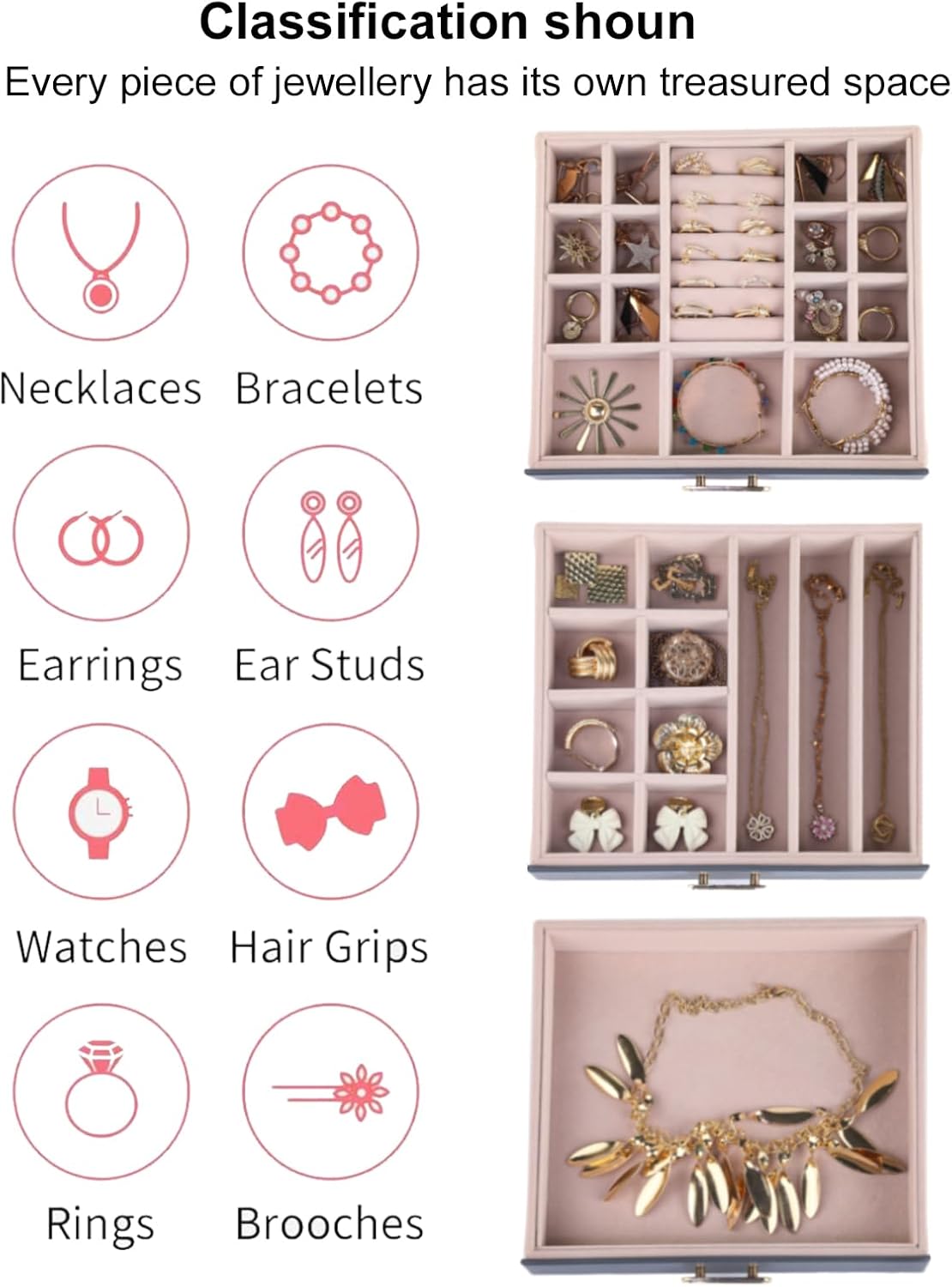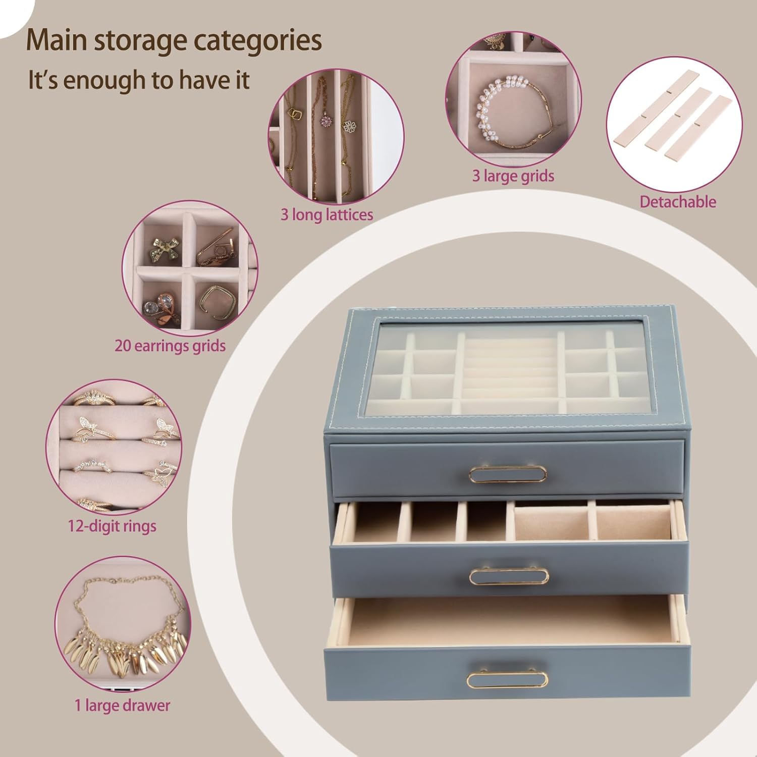"Three-Tiered Precision Organization:Effortlessly categorize your collection with a thoughtfully designed 3-layer system Top Layer: 12 ring slots + 6 stud earring holes keep delicate pieces secure and visible Middle Layer: 8 necklace hooks + 2 bracelet bars prevent chains from and protect metal from scratches Bottom Layer: Spacious compartment with 2 removable dividers for watches, bangles, or travel jewelry cases Every tier works together to eliminate clutter no more rummaging for that matching earring"