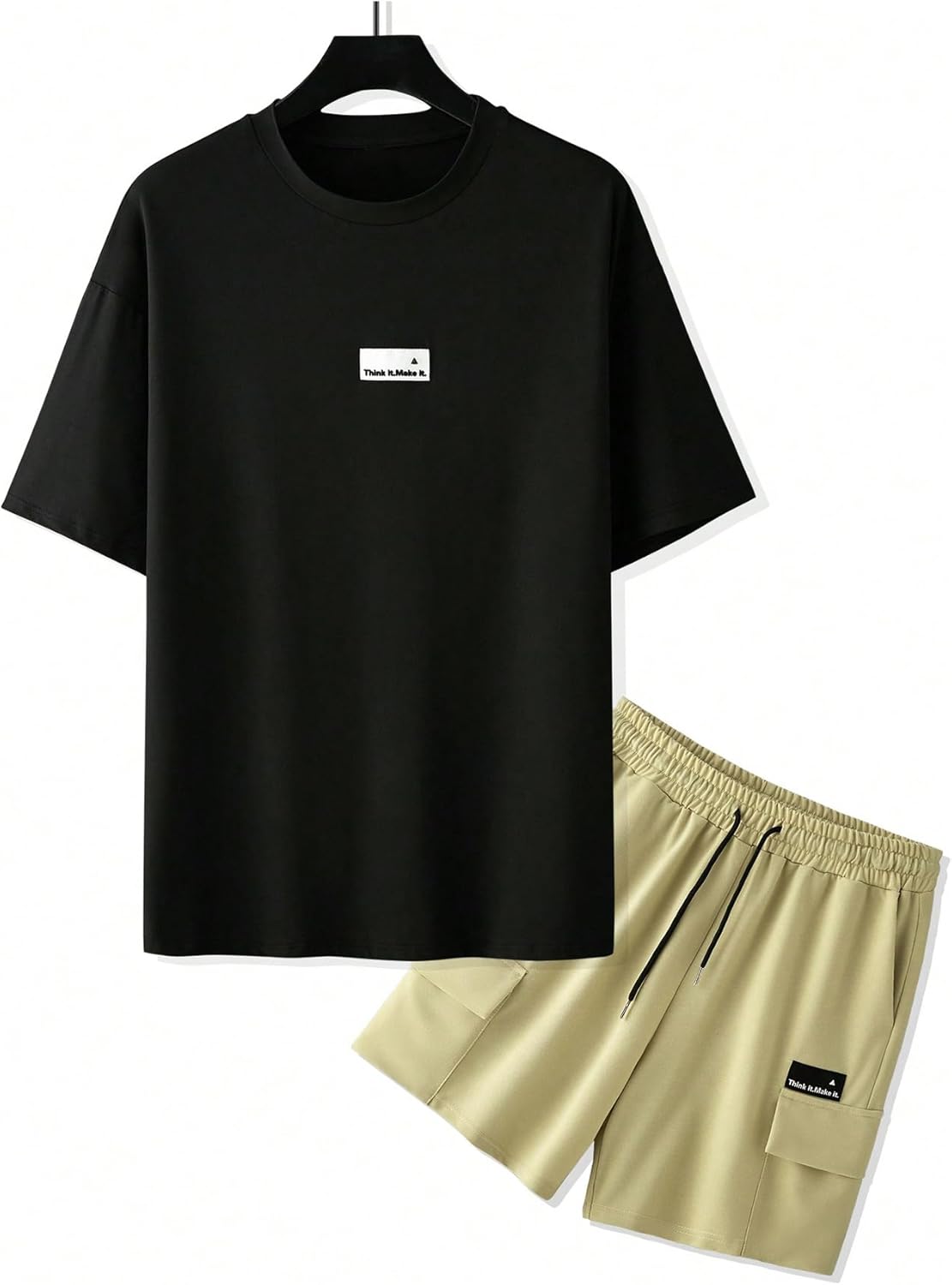 Features: 2 piece summer outfits, tee shirts and short set, letter pathed, short sleeve, round neck, drawstring waist, pockets, casual