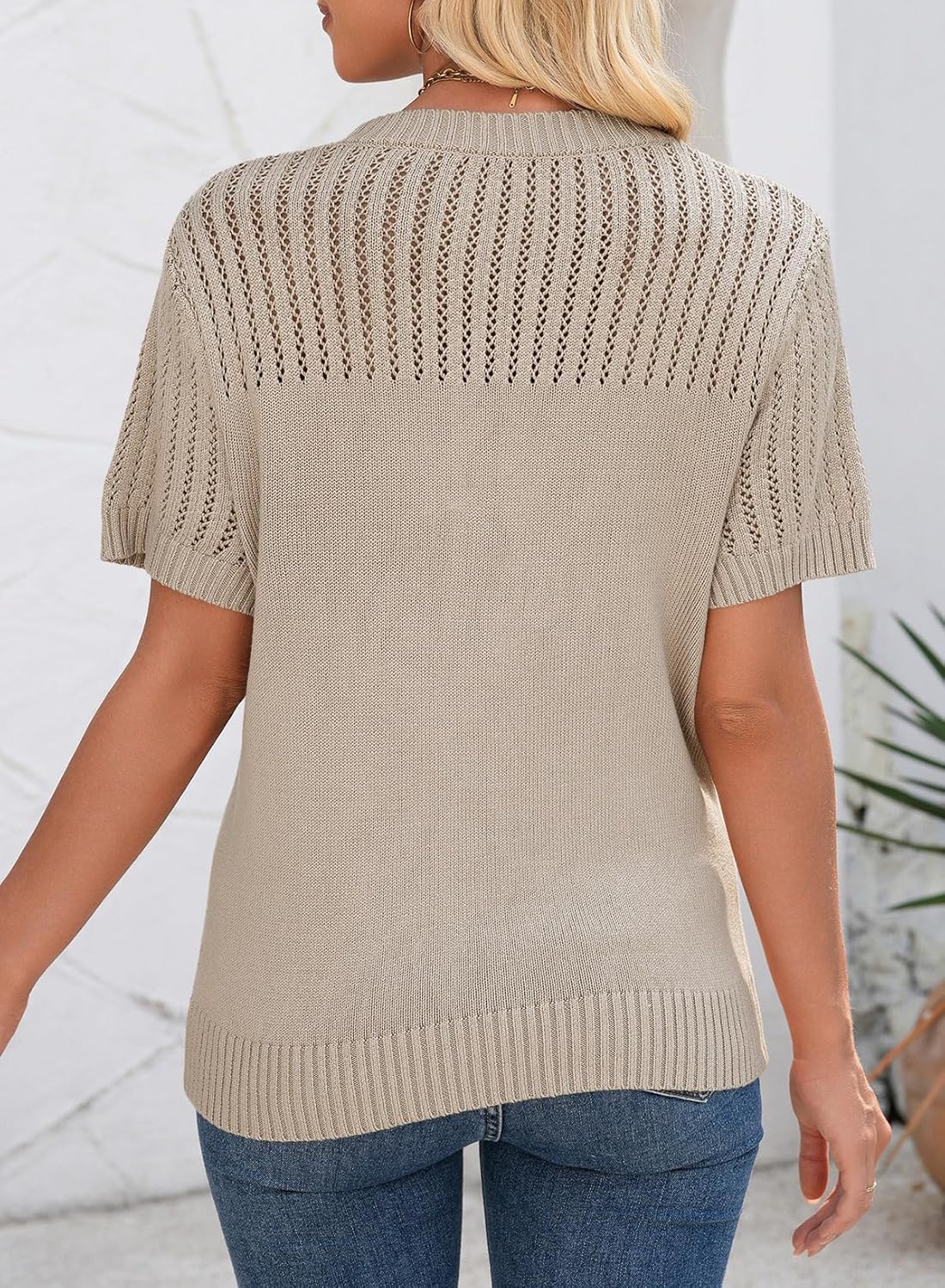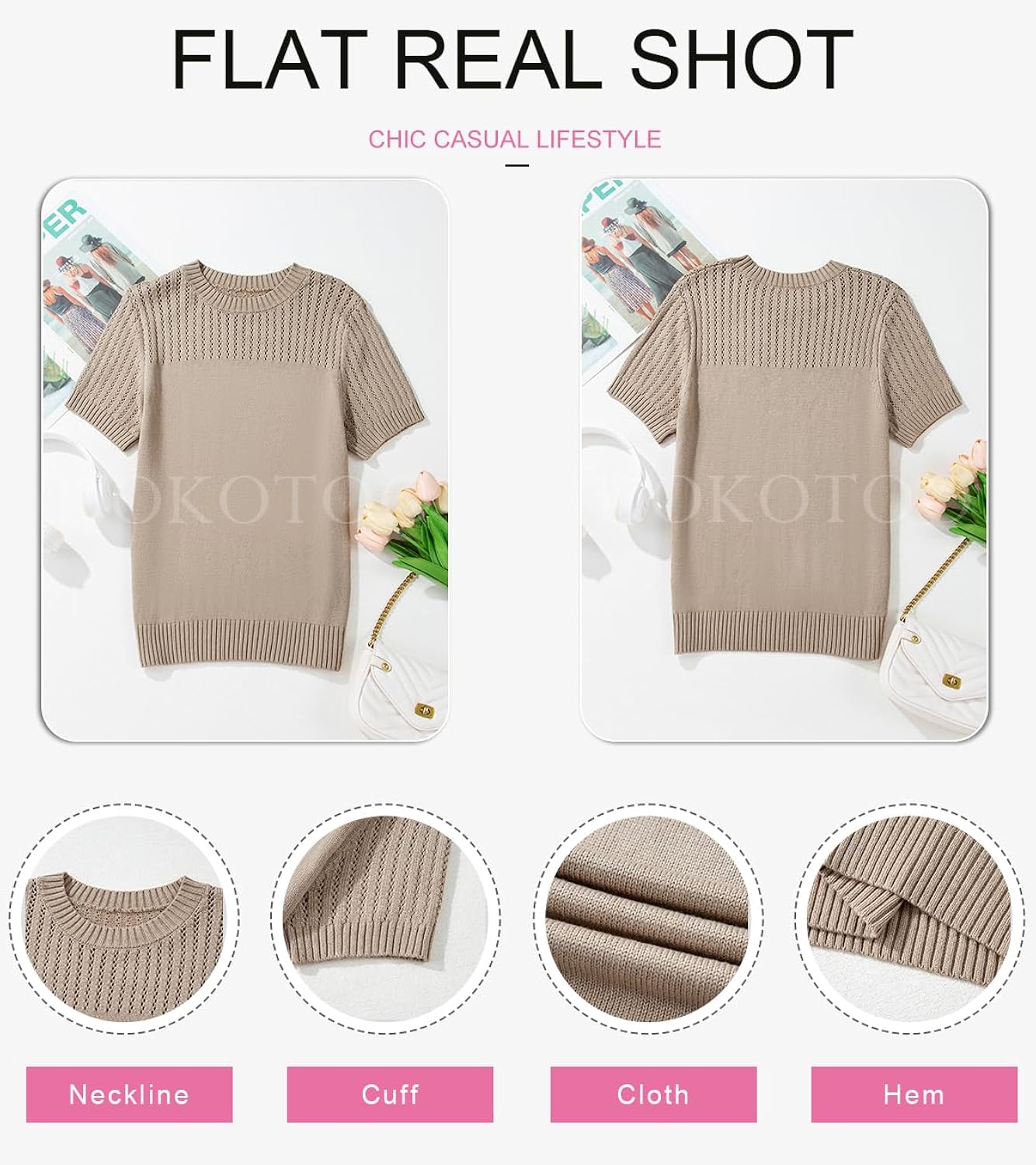 Dokotoo Womens Summer Tops Dressy Casual Crewneck Short Sleeve Shirts Solid Hollow Out Knit Loose Sweater Blouses