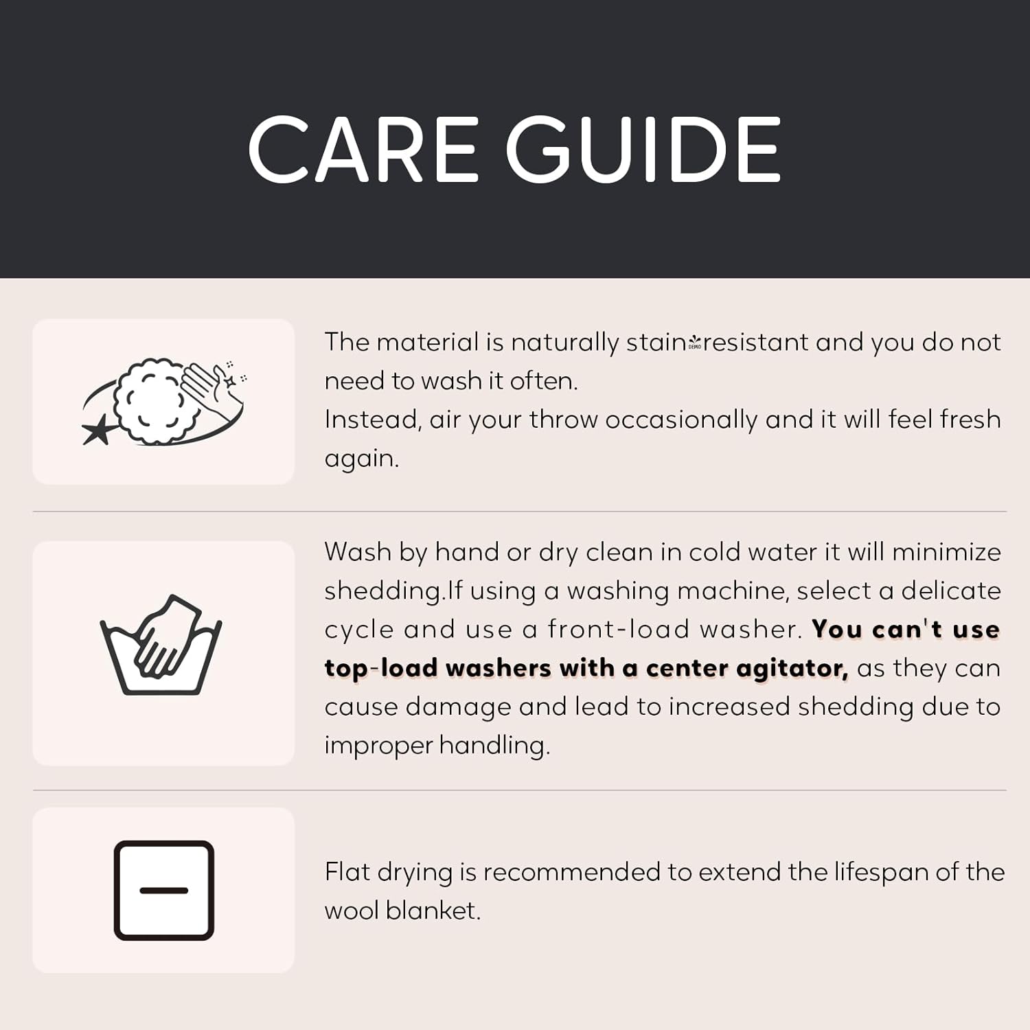 EASY MAINTENANCE-Thanks to wool blanket, it has self-cleaning function, so it is usually washed once every one or two years.Instead, air your throw occasionally and it will feel fresh again. A little shedding is normal during the first wash, but if you can wash by hand or dry clean in cold water it will minimize shedding. In this way, the wool blanket can be protected and the service life of the wool blanket can be extended, and it may also accompany your life directly.If using a washing machine, select a delicate cycle and use a front-load washer. You can't use the top-load washers with a center agitator, as they can cause damage and lead to increased shedding due to improper handling.