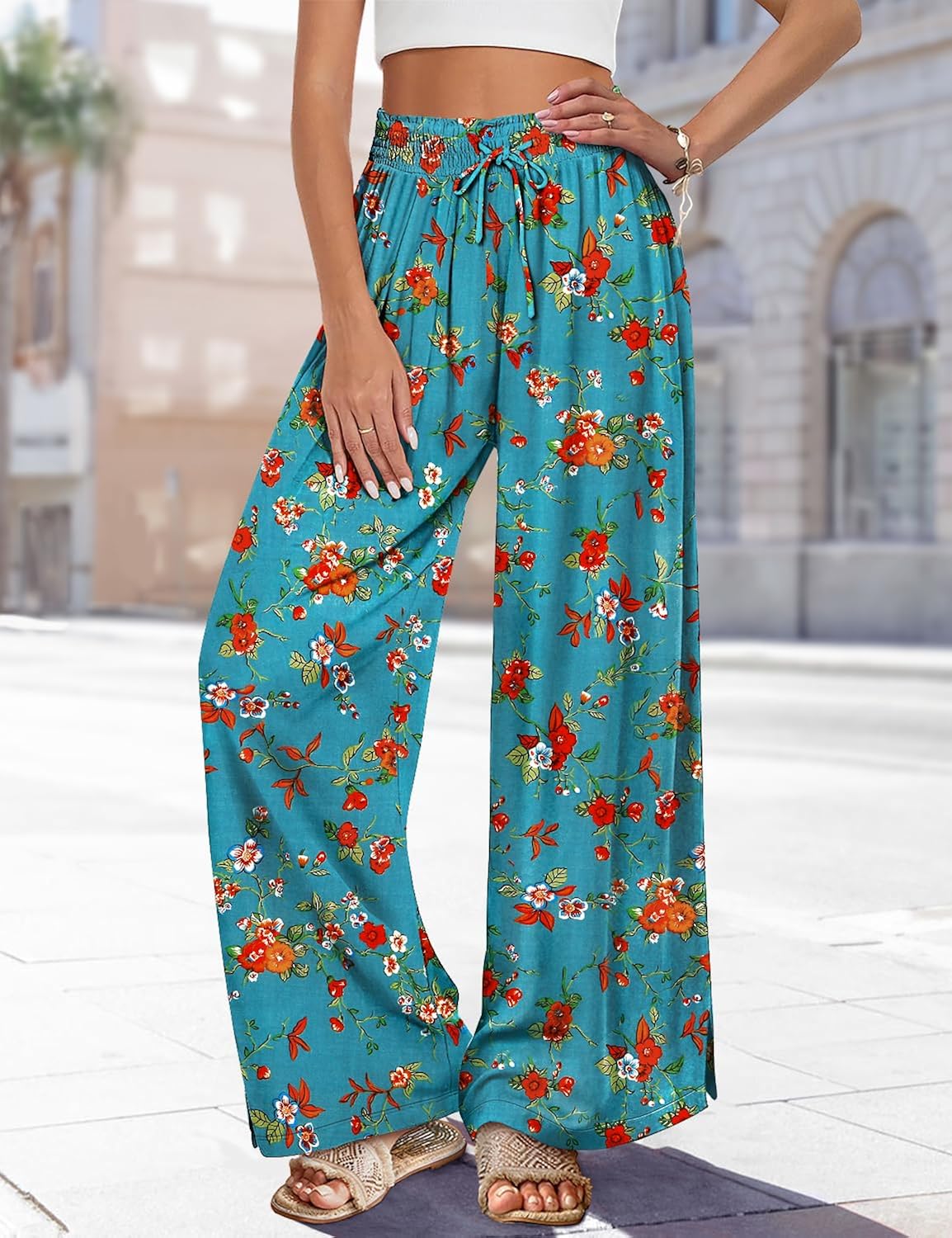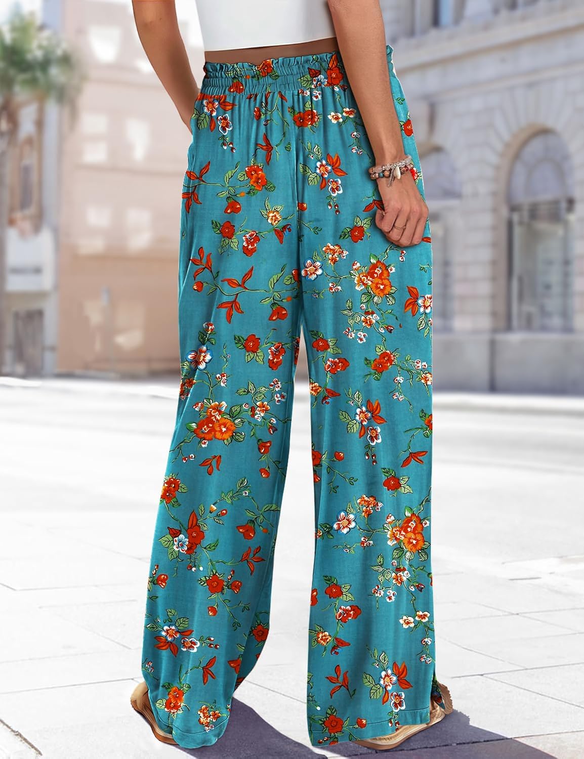 YESNO Women Summer Boho Palazzo Pants High Waist Wide Leg Floral Casual Cotton Lounge Trousers with Pockets PP0