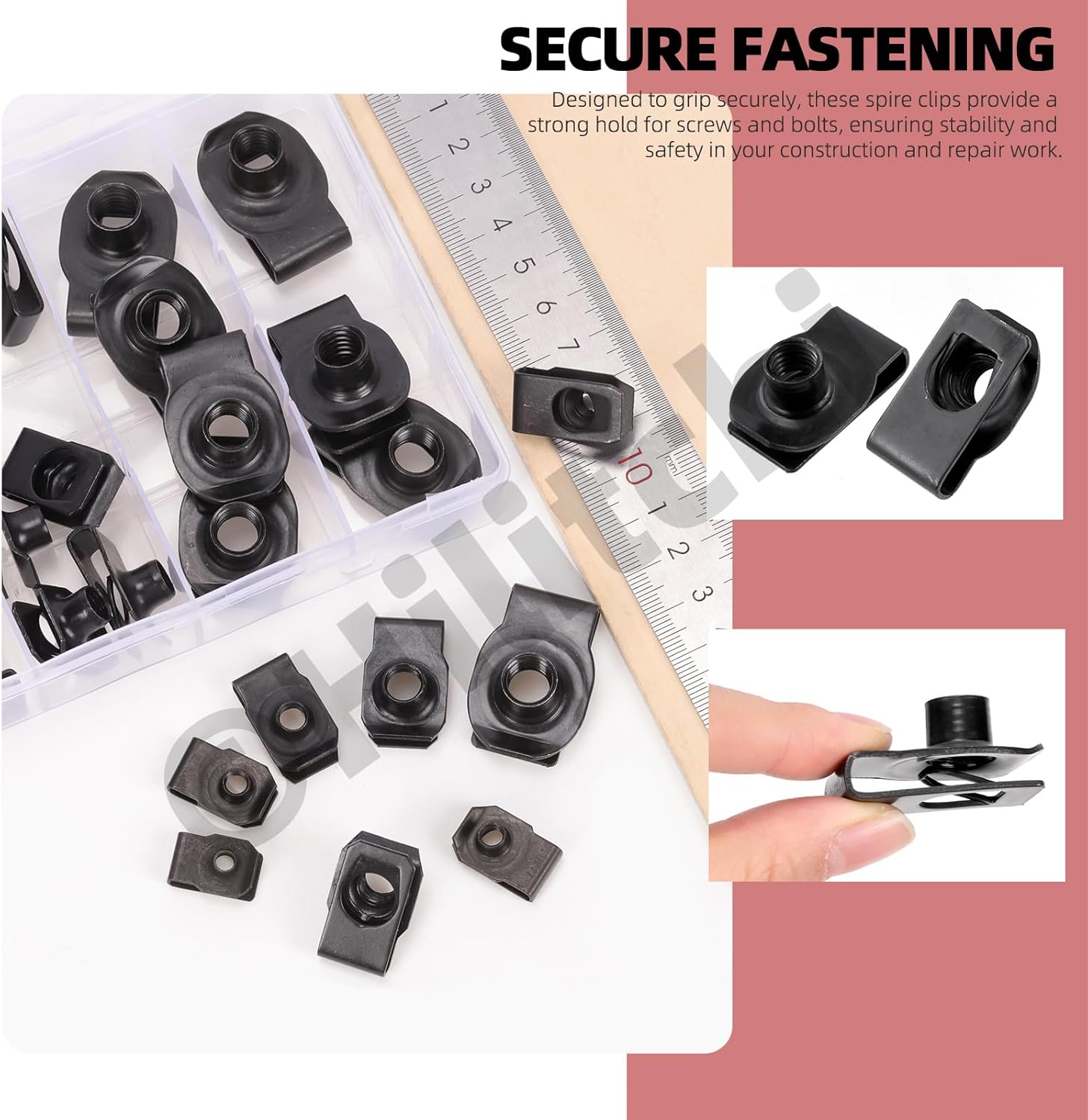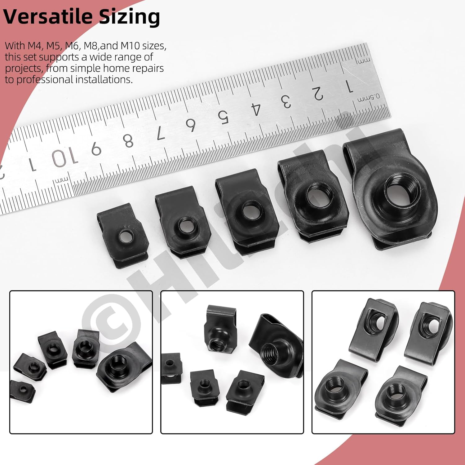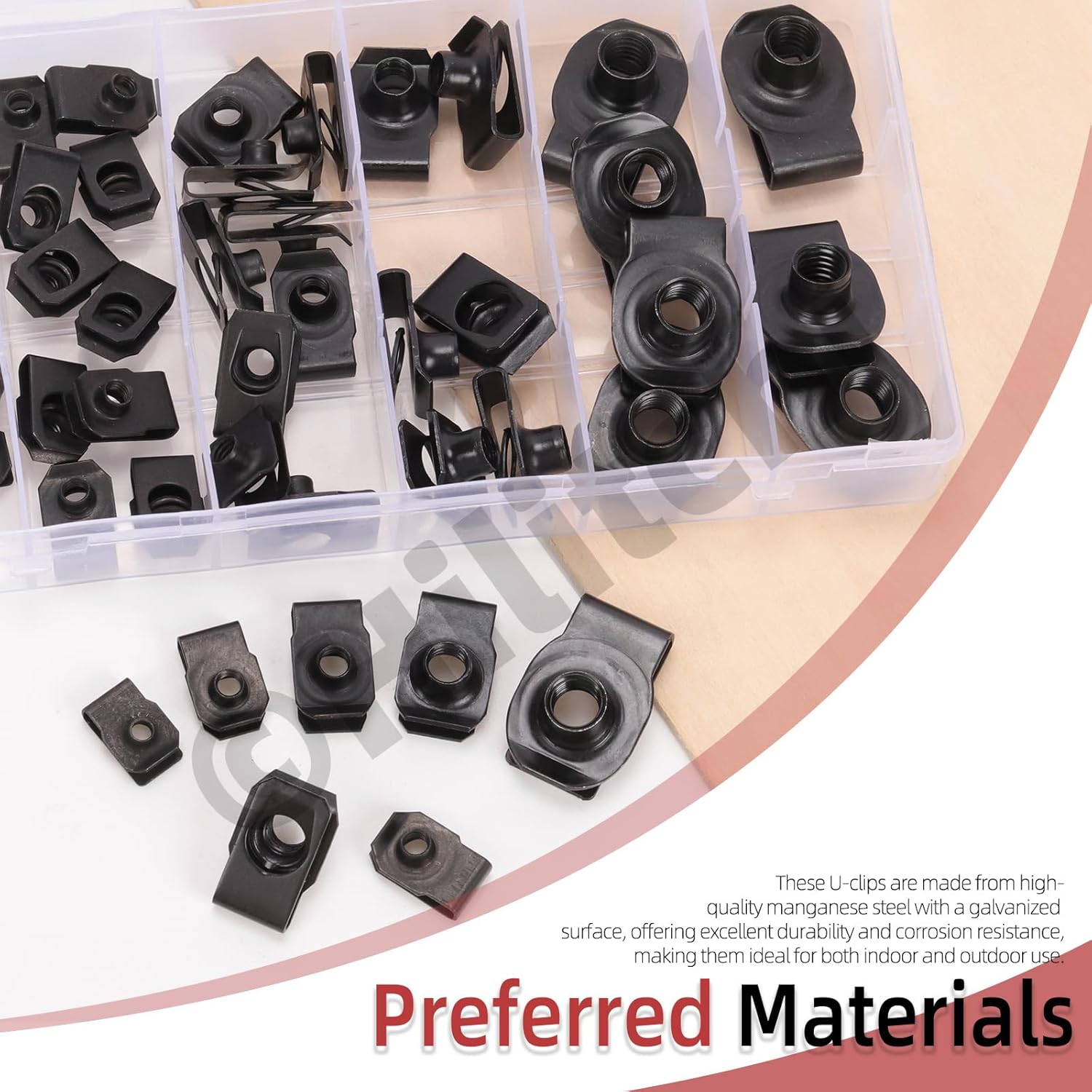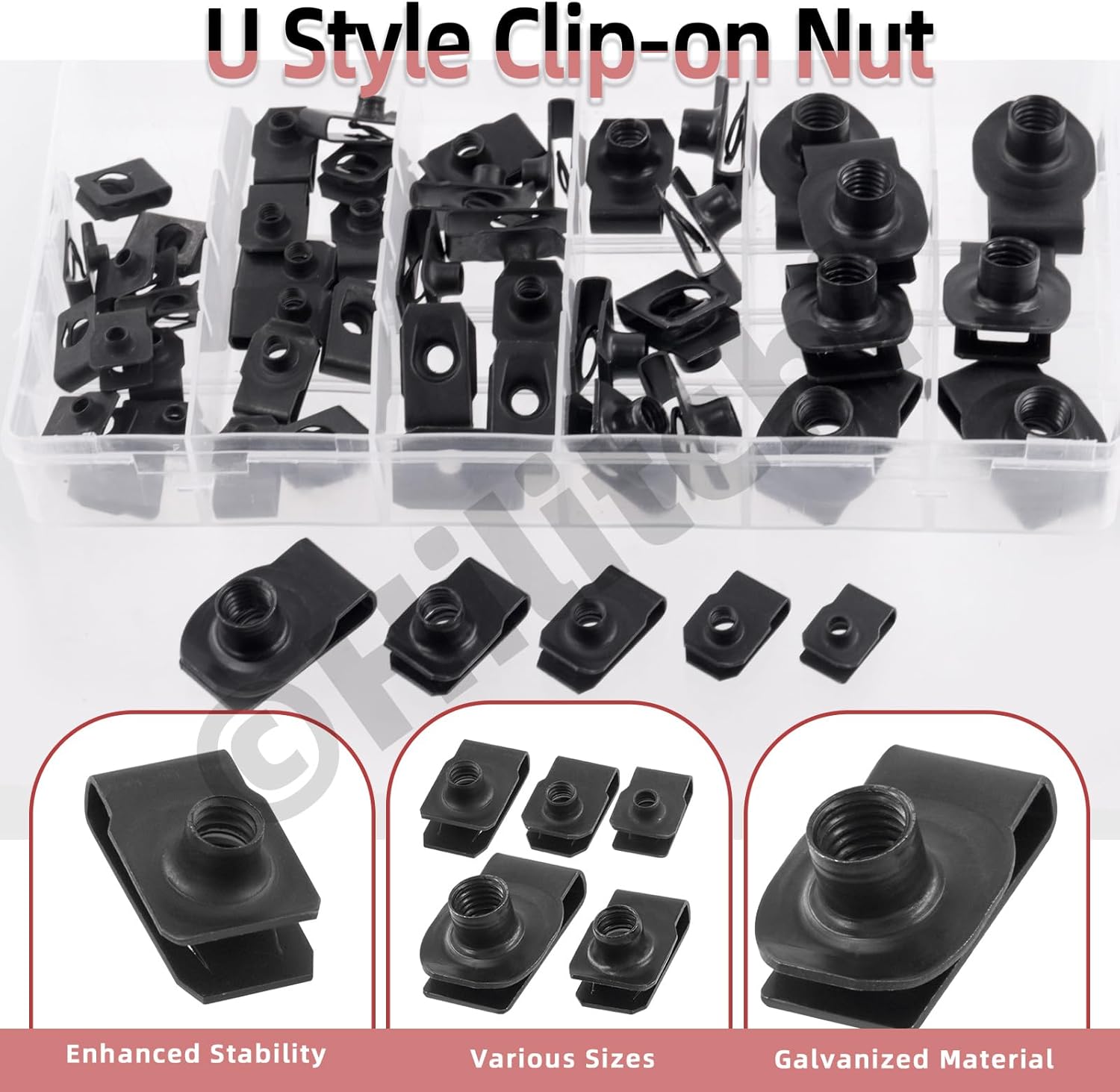 ?【Wide Application】Extruded u type nuts are widely used in various body panels, vehicle dashboard clamping projects, door decorations, radiator covers, mudguards, bumpers, engine hoods, splash guards, and license plates for automobiles and motorcycles. Suitable for fastening car body panels or molded parts, it is a common hardware component.