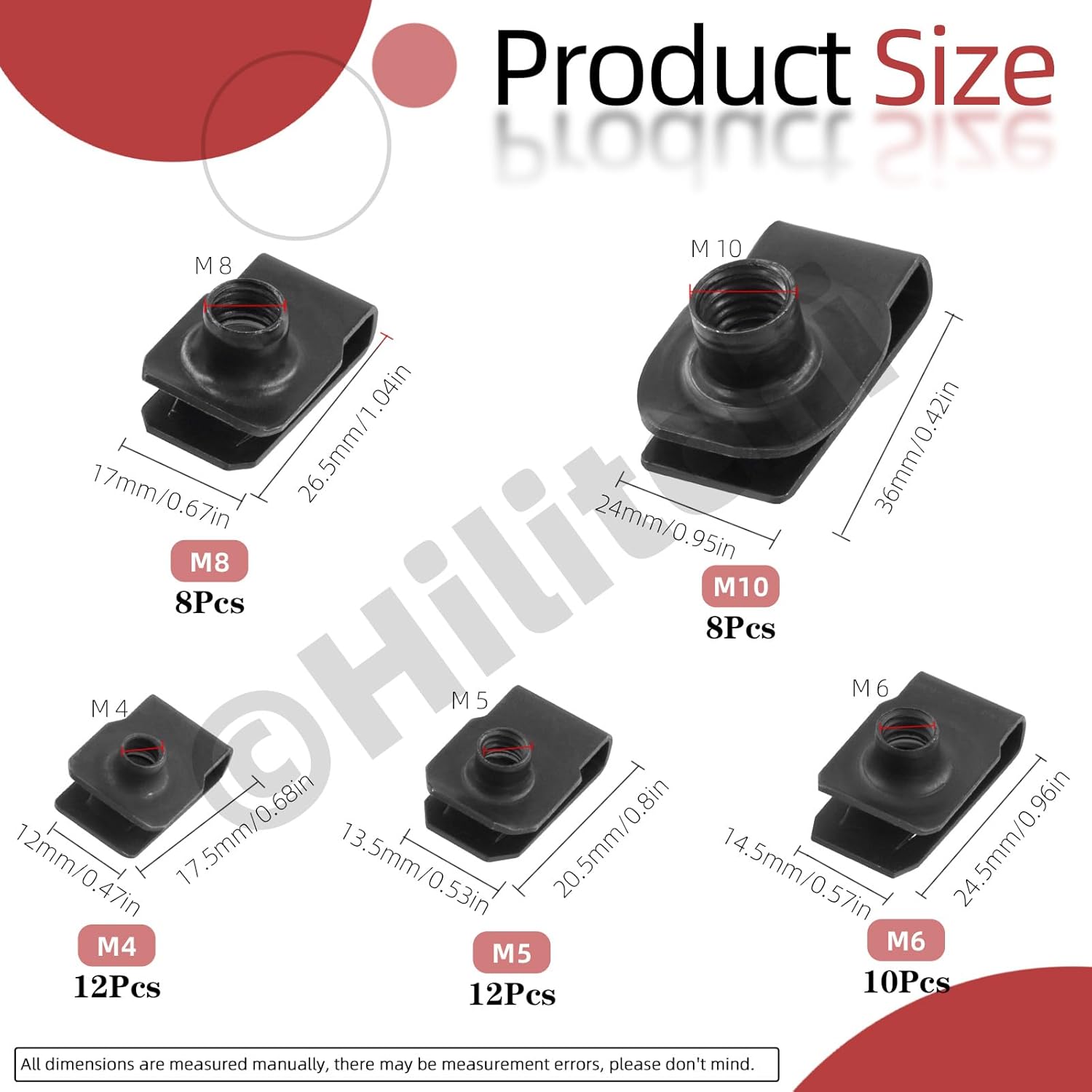 ?【What You Will Get】In this kit, you will get u-style clip-on nut in 5 sizes, 12pcs m4 extruded u-nut, 12pcs m5 extruded u-nut, 10pcs m6 extruded u-nut, 8pcs m8 extruded u-nut, and 8pcs m10 extruded u-nut, in total 50pcs. They are packed well in a durable transparent box for easy storage and carrying. Sufficient quantity can meet your needs of daily use.