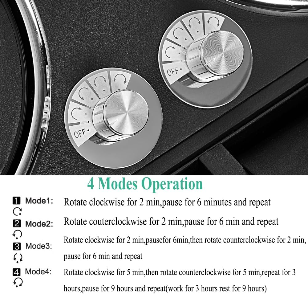 4 ROTATION MODES WATCH TURNER: Mode 1: rotate clockwise for 2 minutes, stop for 6 minutes, recycle; Mode 2: rotate counterclockwise for 2 minutes, stop for 6 Minutes, recycle; Mode 3: Rotate clockwise for 2 minutes, stop for 6 minutes; rotate counterclockwise for 2 minutes, stop for 6 minutes, recycle; Mode 4: clockwise for 5 minutes, rotate counterclockwise for 5 minutes, work for 3 hours and stop 9 hours