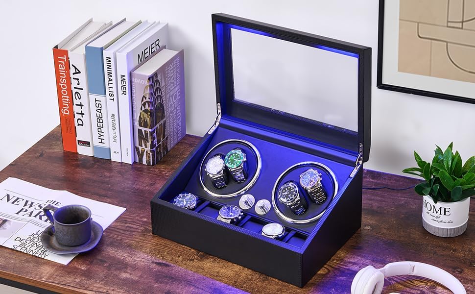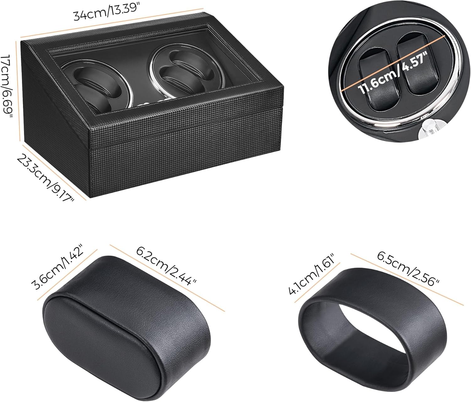LUXURY WATCH SHAKER: The surface is made of carbon fiber material, elegant and luxurious. Product size 13.39”L X 9.17”W X 6.69”H. The design of opening the cover and stopping rotation is very thoughtful. Ant-magnetic keep your watch safe and running very precision. Built-in LED backlight enhances the display atmosphere