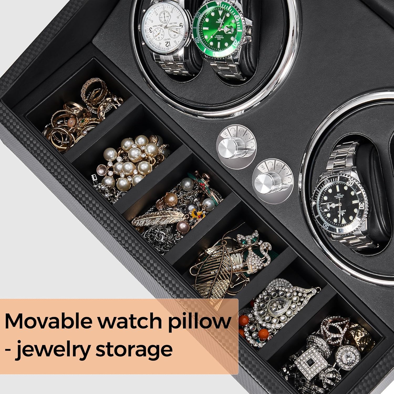 4+6 WATCH WINDER: 4 winding slots and 6 storage slots for organizing your watches. 4 watch pillows with pillow rings, suitable for watches of different girths. 6 movable watch pillows can be used as jewelry boxes to store jewelry. 2 motors can operate separately, selecting different modes while meeting different watches