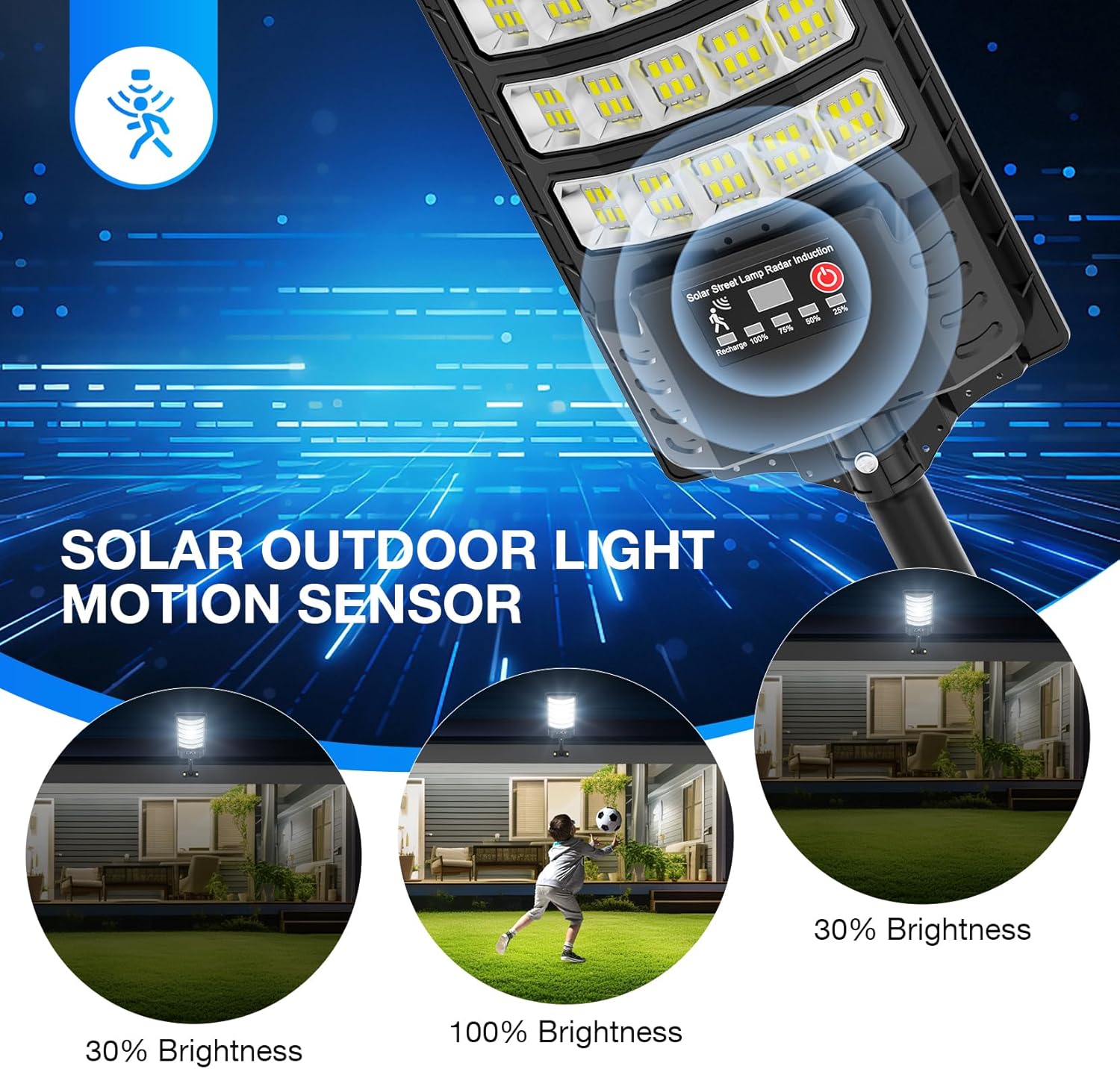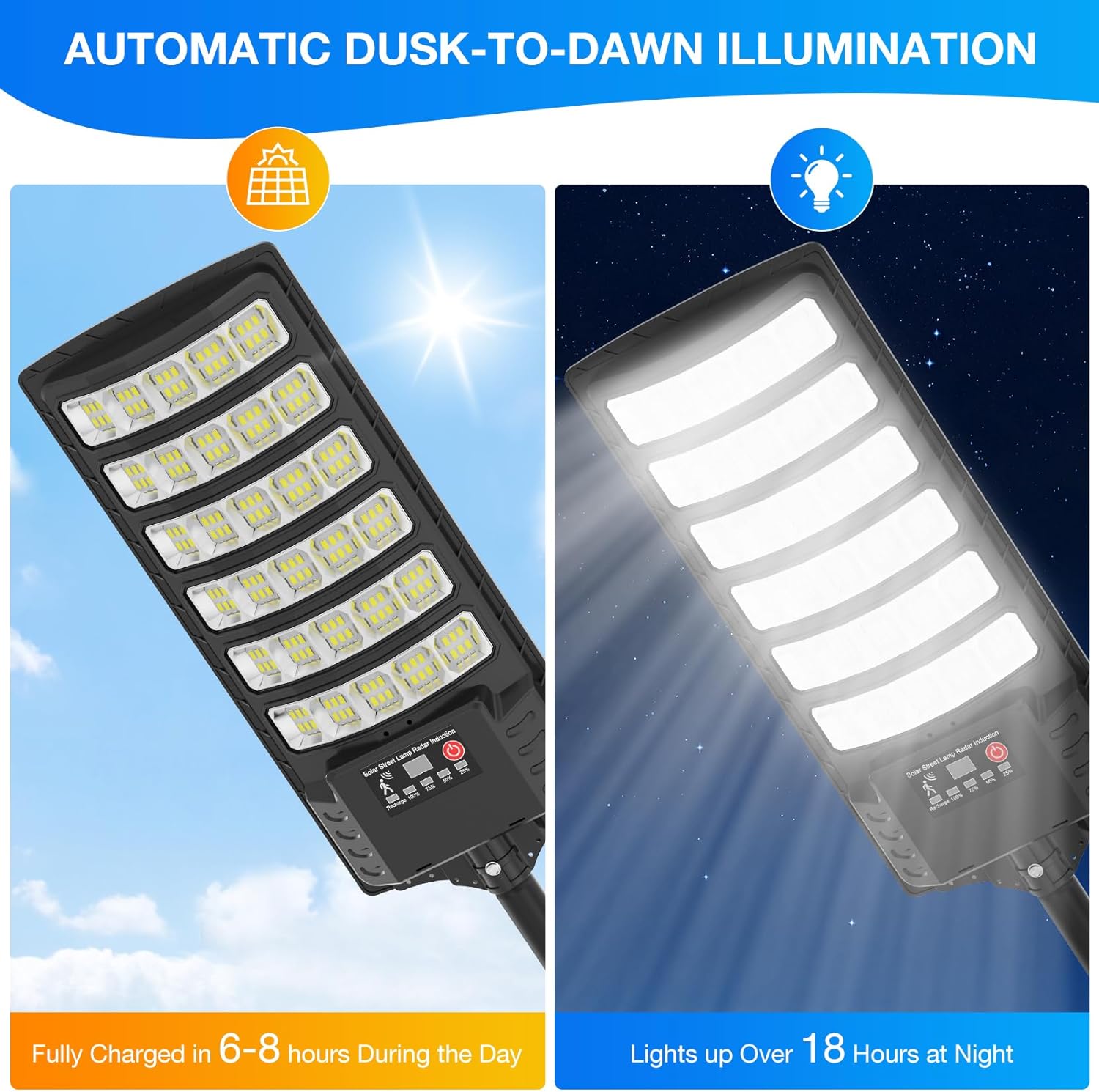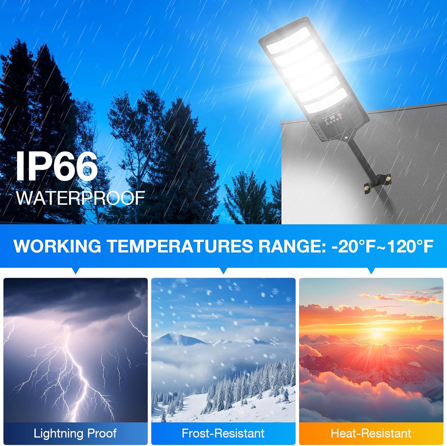 [Improve the brightness of the lighting]: outdoor solar street lights using metal brackets, work life exceeds 30,000+ hours.high efficiency and high brightness 5730 LED lamp beads, color temperature of 6500K, long working life, high brightness, low light decay; Upgrade high-capacity batteries and solar energy conversion panels to improve energy conversion rates.The brightness is 200% higher than that of other ordinary solar LED lamps.The installation height can reach up to 13-20 ft, and the illuminated area can be as large as 400-700 sq. ft.