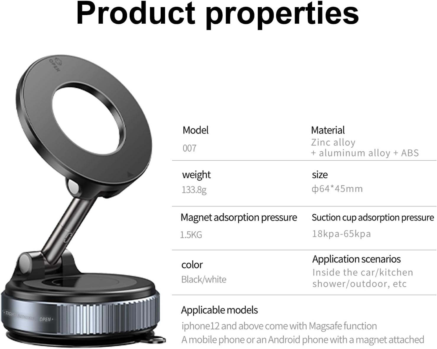 Car suction cup vacuum magnetic phone holder: The upgraded suction cup phone holder can easily connect to any smooth surface, such as glass/central screen/room glass/marble tabletop, by simply rotating the dial. The N52 strong magnet on the front can generate strong attraction and easily attach your phone in less than 1 second.