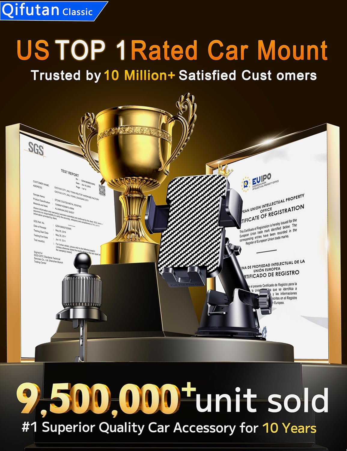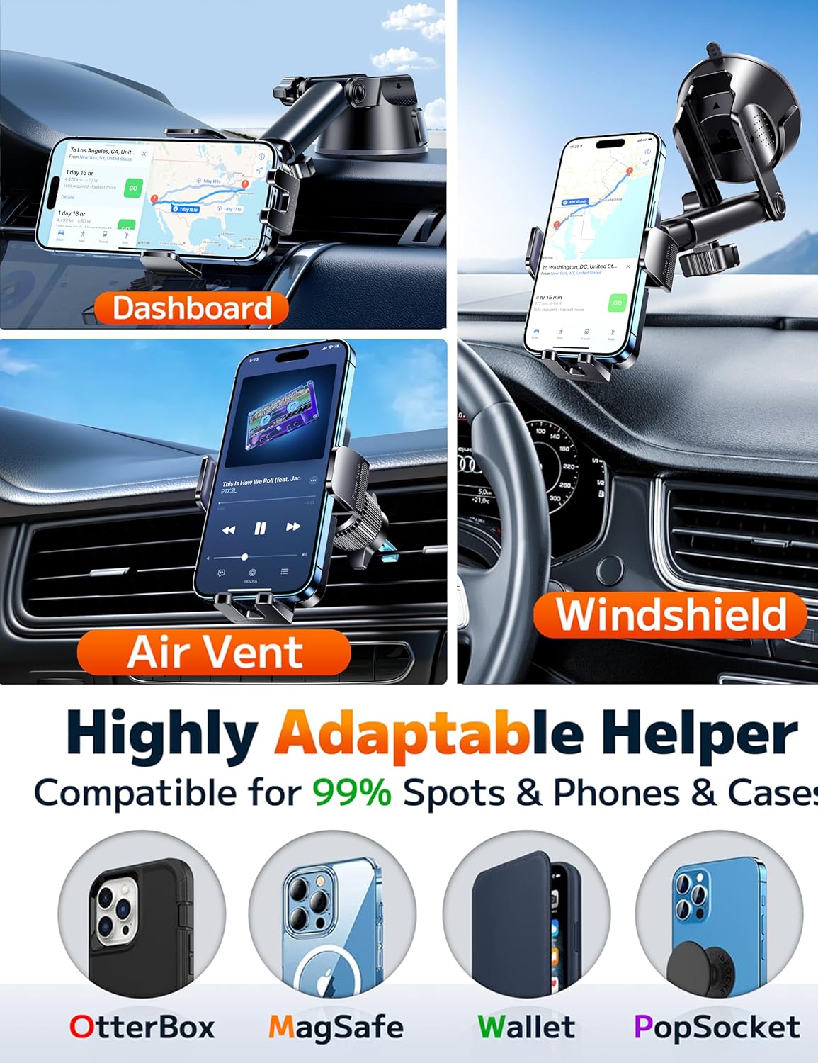Versatile Car Phone Mount: Cell phone car mount boasts premium suction strength and an upgraded air vent clip, allowing for flexible installation options on windshields, dashboards, and air vents.