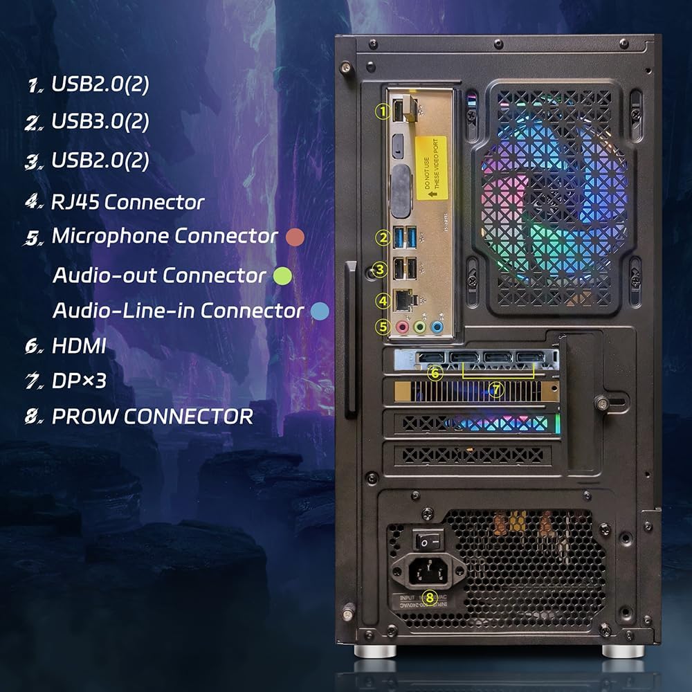 Gaming Desktop Connectivity: This gaming pc comes with RGB Fan x 5 | 1x RJ-45 | USB 600M Wi-Fi | USB Bluetooth 5.0 | AMD Radeon RX 590 8G GDDR5 Video Card | HDMI | DisplayPort